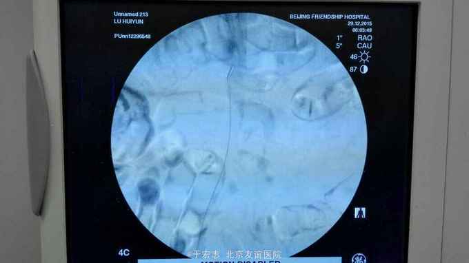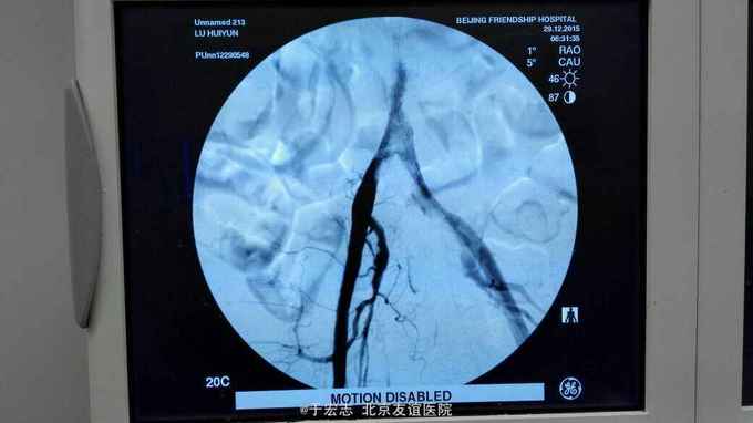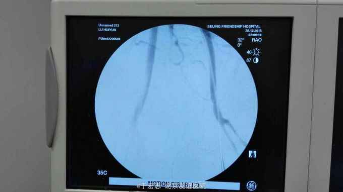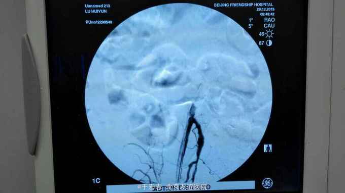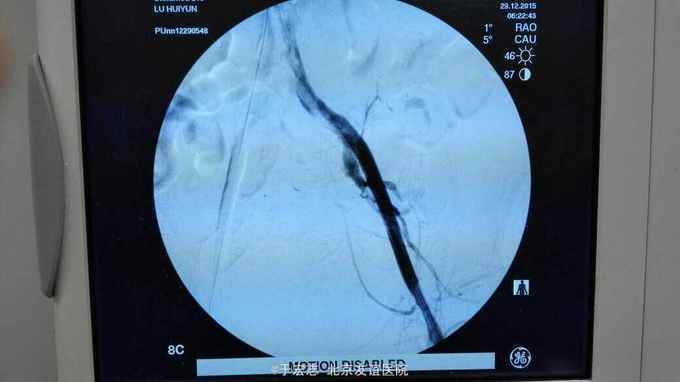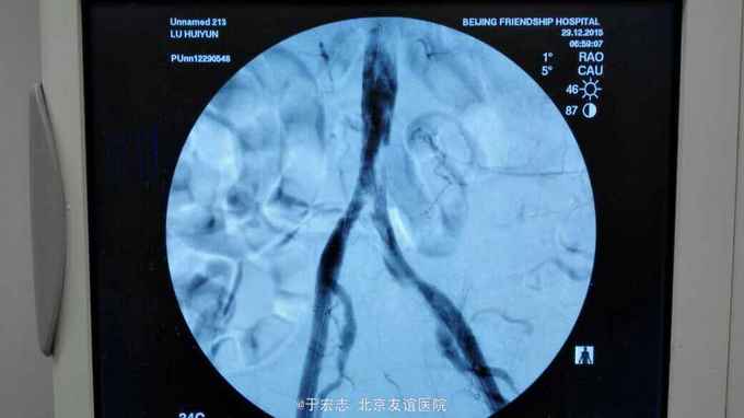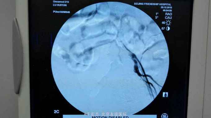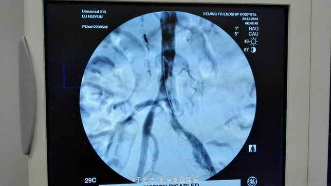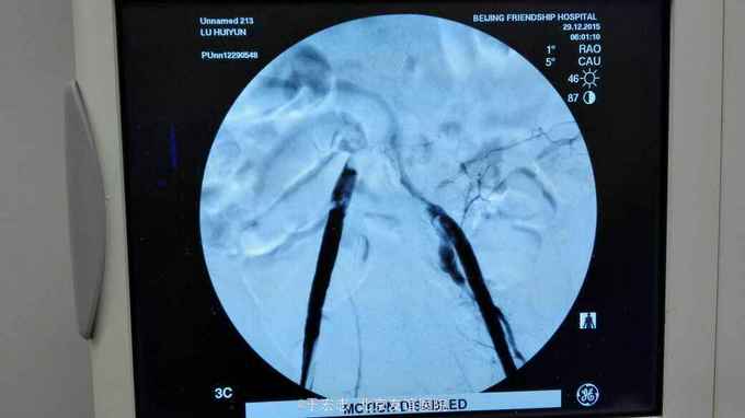 全腔内技术操作,用8F rotarex机械取栓导管操作,术前留置股静脉鞘,边操作边放静脉血,减少毒素吸收。静脉血经自体血回收处理。 操作完成后以血管缝合器缝合股动脉穿刺点,加压包扎。 患者转重症医学科途中出现心跳骤停,于手术室心外按压2小时复苏成功,转重症医学科血滤治疗。术后五小时生命体征均可维持,但家属还是放弃进一步治疗转运回当地治疗。