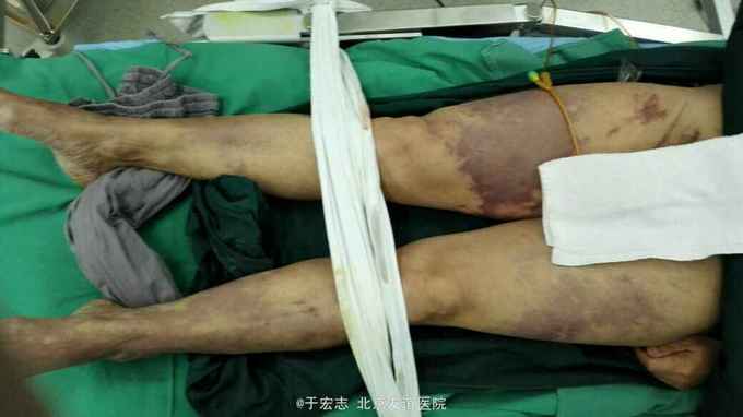 查体,双下肢大片皮肤青紫,双小腿无感觉,双股动脉波动消失