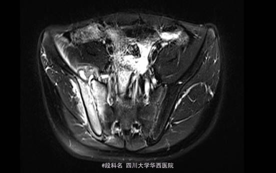 查体:右髋局部无红肿,有压痛,皮温不高,感觉无减退。右侧髋伸屈、外展、内收,因疼痛无法评测。右膝屈曲4级,伸膝3级,踝背伸、跖屈4级 。左侧肌力正常,肌张力正常。右侧直腿抬高试验40°(+),加强实验(+),右侧4字实验(+)。辅助检查:当地医院CT检查示:L4/5椎间盘轻度膨出,L5/S1椎间盘轻度突出,建议MRI检查。我院血常规示:血小板计数 425 10X9/L,白细胞计数 12.26 10^9/L,中性分叶核粒细胞绝对值 8.34 10^9/L。生化示:血沉53.mm/h,C反应蛋白(CRP)42.80mg/L。痰涂片抗酸染色(连续3次):未查见抗酸杆菌。免疫球蛋白A 4050.00 mg/L ↑ 免疫球蛋白M 2240.00 mg/L ↑C-反应蛋白 31.80 mg/L ↑。T细胞亚群正常。CD3细胞亚群 71.40 %CD4细胞亚群 37.00 % CD8细胞亚群 29.80 % CD4/CD8比值 1.24。痰培养示:产酸克雷伯氏菌 混丛,较多。结核抗体检测 阴性 。骨盆MRI示:右侧骶髂关节面骨质见斑片状长T2WI及长T1WI信号,关节间隙模糊、局部狭窄,邻近髂腰肌、梨状肌、臀肌群见斑片状T2WI高信号影。左侧骶髂关节及双侧髋关节未见确切异常。