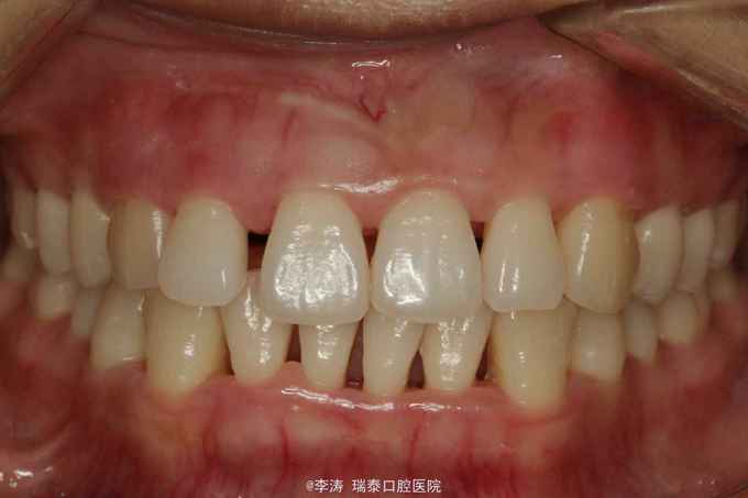 患者女24,主诉前牙缝隙就诊,自诉1年以前没有缝隙,现慢慢长大,刷牙出血