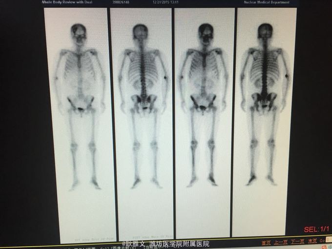 右乳腺Ca术后,2014年12月曾行全身骨扫描,未发现转移灶,现全身多部位疼痛,遂行全身骨扫描