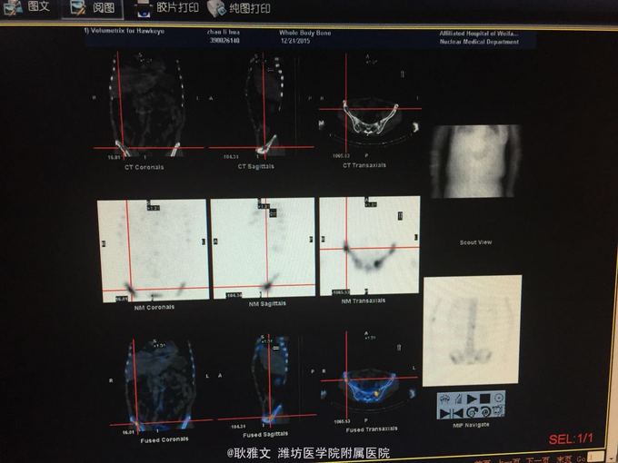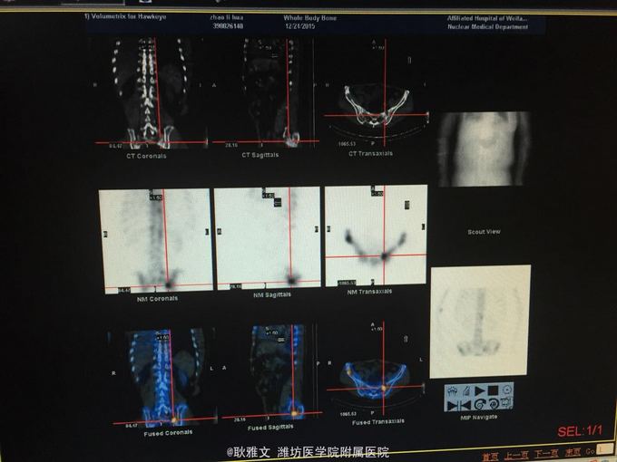 行ECT全身骨扫描显示,T12——L1椎骨部位局限性放射性增高,双侧骶髂关节部位放射性增高,进一步行断层显像,显示放射性增高部位骨质呈混合型改变(包括溶骨性改变和成骨性改变)