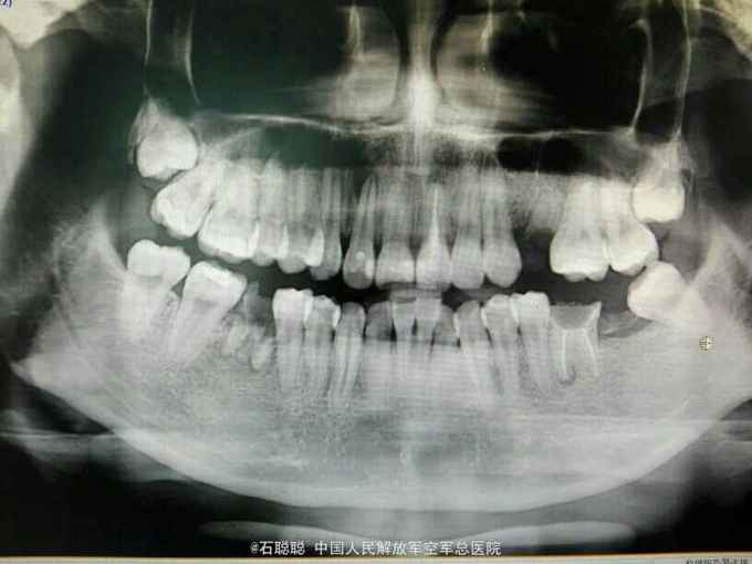 检查:21牙体变色,切缘磨耗不均匀,舍面见牙色充填体完整在位,无松动,叩痛-,牙龈未见明显异常。 根尖片:21根管内高密度充填影像,恰填;12根尖远中见直径约3mm低密度透射影像 曲面断层:36、46残根,根尖低密度影