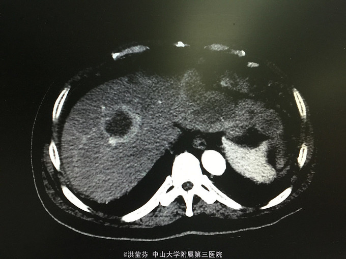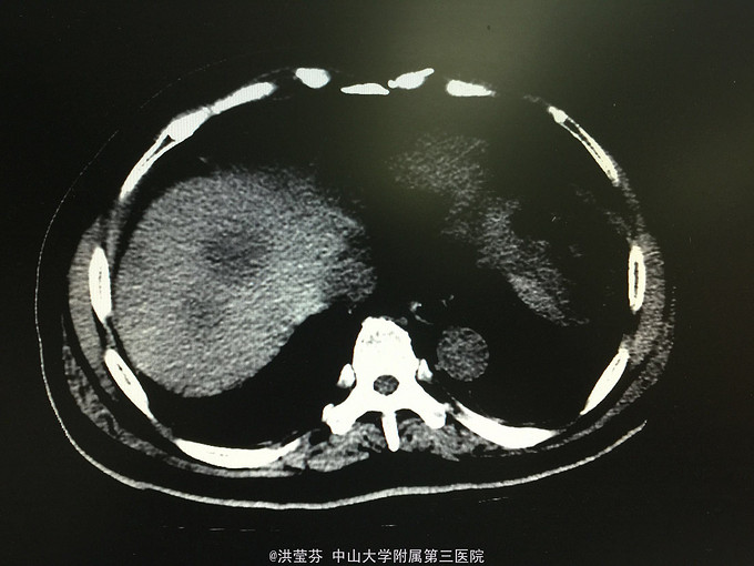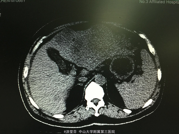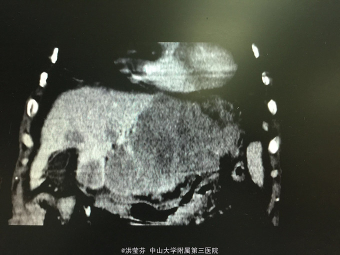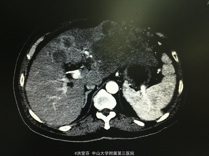 查体:上腹部轻压痛,无反跳痛。 辅助检查:上腹部CT增强提示:肝S2/3/4段恶性肿瘤,肝内多发子灶,肝左静脉及门静脉左、右支受侵;腹腔多发转移瘤;肝门部、腹膜后多发肿大淋巴结;门静脉海绵样变;少量腹水。胸部CT提示:1、双肺多发小结节,结合病史,考虑转移瘤;纵膈、双侧肺门多发肿大淋巴结。2.双肺炎症;左侧胸腔少量积液。CA125 555.1IU/nl,CA199 1093.5IU/nl。