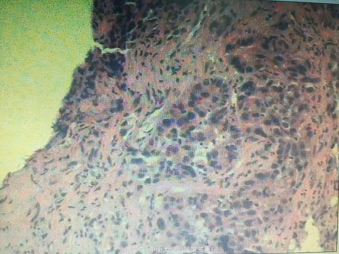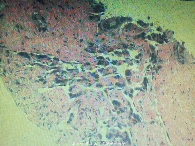 诊断考虑胆管细胞癌可能性大,予完善肝穿刺,活检病理示:符合中分化腺癌,胆管细胞癌可能性大。免疫组化结果示:Hep(-),CK(+),CK19(+),CEA(-),CDX-2(-),DK20(-),Ki 67(约15%),TTF-1(-)。诊断明确肝内胆管细胞癌,IV期,无明显化疗禁忌,予GP方案化疗,辅以护胃、护肝、止吐等治疗。
