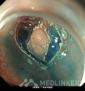 随访:出院后患者每年复查肠镜,未见复发。 讨论:结直肠癌大多起源于结直肠早癌及腺瘤等癌前病变,若在发展到浸润 癌之前发现并予以切除,即可取得预防或根治效果。随着内镜技术的发展,尤其是EMR/ESD技术的不断成熟,从早期诊断到治疗及预后,与传统开腹手术相比优点突出,但要严格把握其适应症,由于技术难度大,出血、穿孔等是常见并发症。EMR/ESD是经济、安全、可靠的治疗结直肠早癌及癌前病变的方法。
