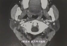 查体示颈部触及微小结节,气管位置居中;CT示:颈部迷走神经分支处出现高密度散发结节影,分布在颈部神经包膜边缘,未侵及神经层。