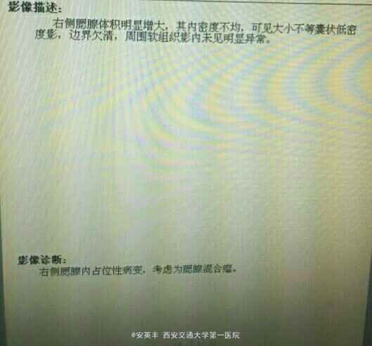 入院查体:触及右侧腮腺肿物约“红枣”大小,质地硬,活动度差,无压痛。行腮腺平扫示:右侧腮腺体积增大,其内密度不均,可见大小不等的囊状低密度影,边界欠清,周围软组织未见异常。考虑腮腺混合瘤。