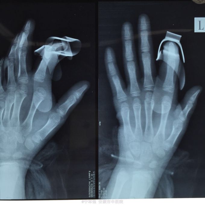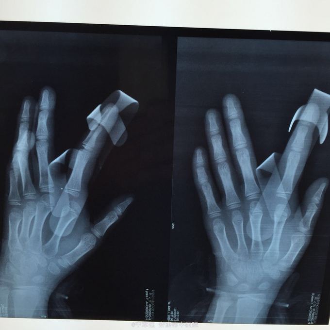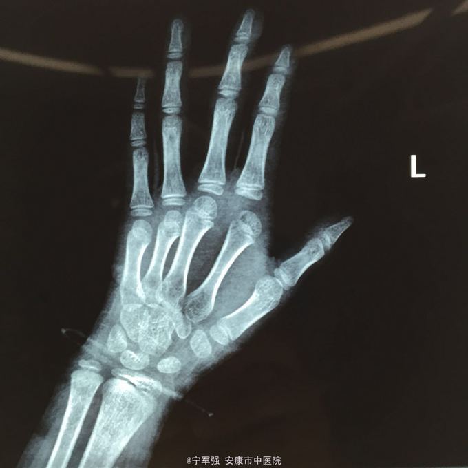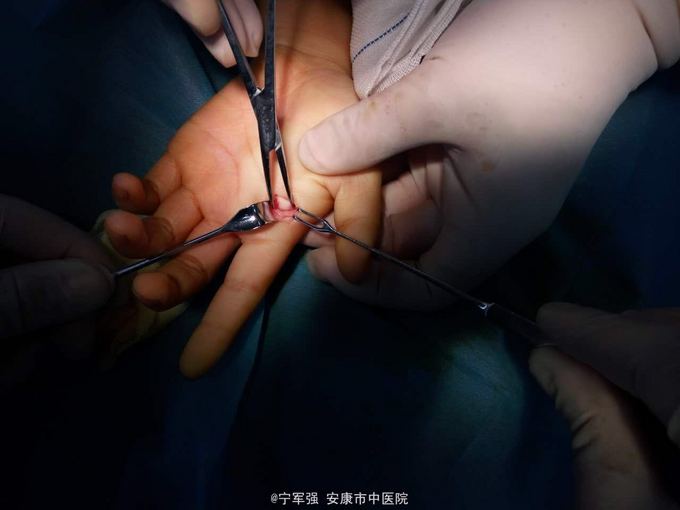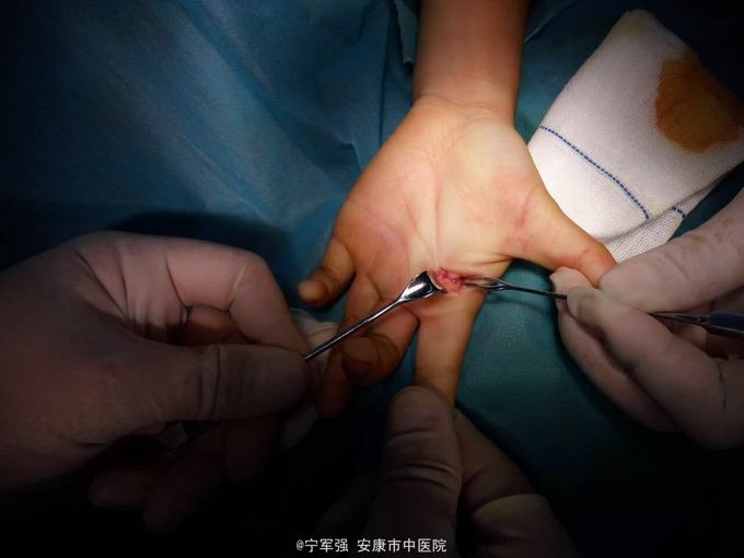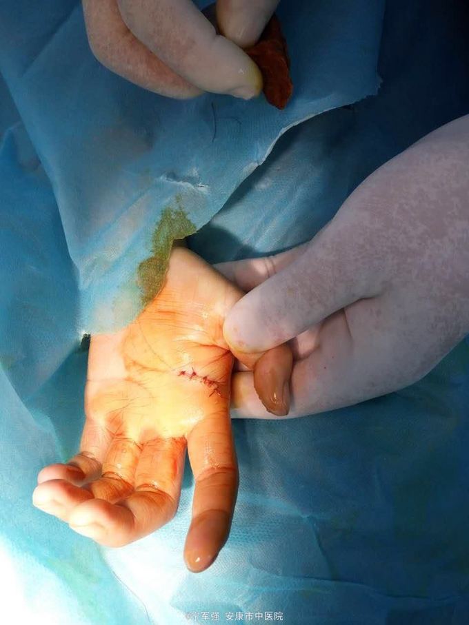 诊断:左手第二掌指关节脱位 处理,予以手法复位失败!考虑关节囊坎顿,阻止复位 予以局麻小切口探查证实,复位脱位,修补关节囊