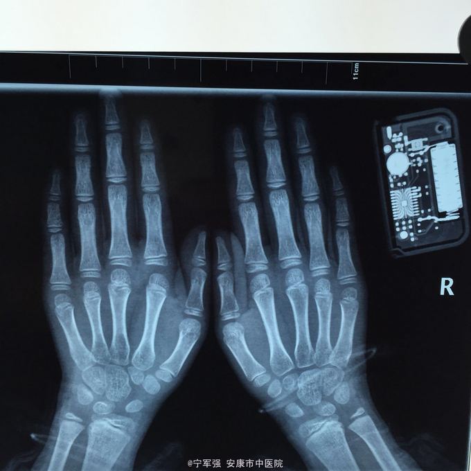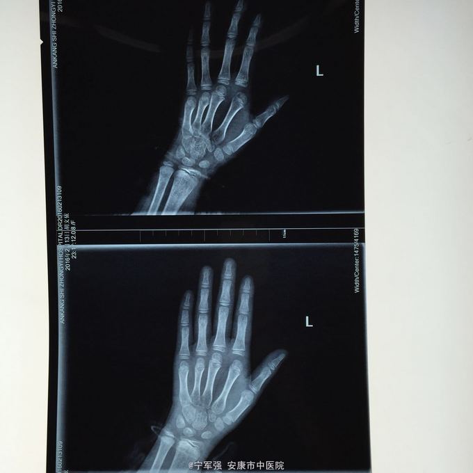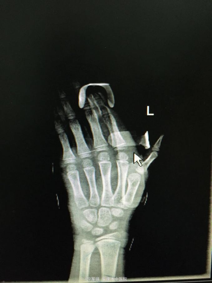 患者8岁,女 扭伤致左手食指肿痛活动受限2小时