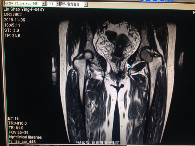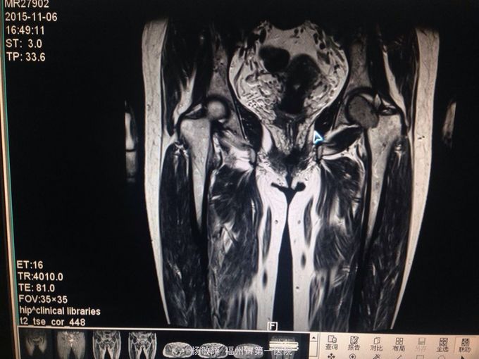 跛行步态,左髋部轻压痛、左腹股沟处压痛明显,左髋部活动受限,以内收为甚,4字实验(+);thomas征(-),trendelenbug征(-);左下肢缩短1cm,余四肢查体未见明显异常。