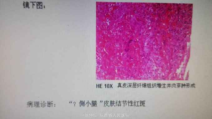 完善相关检查后,行皮肤活检术,病理结果提示结节性红斑。常规抗炎、对症支持治疗后好转。