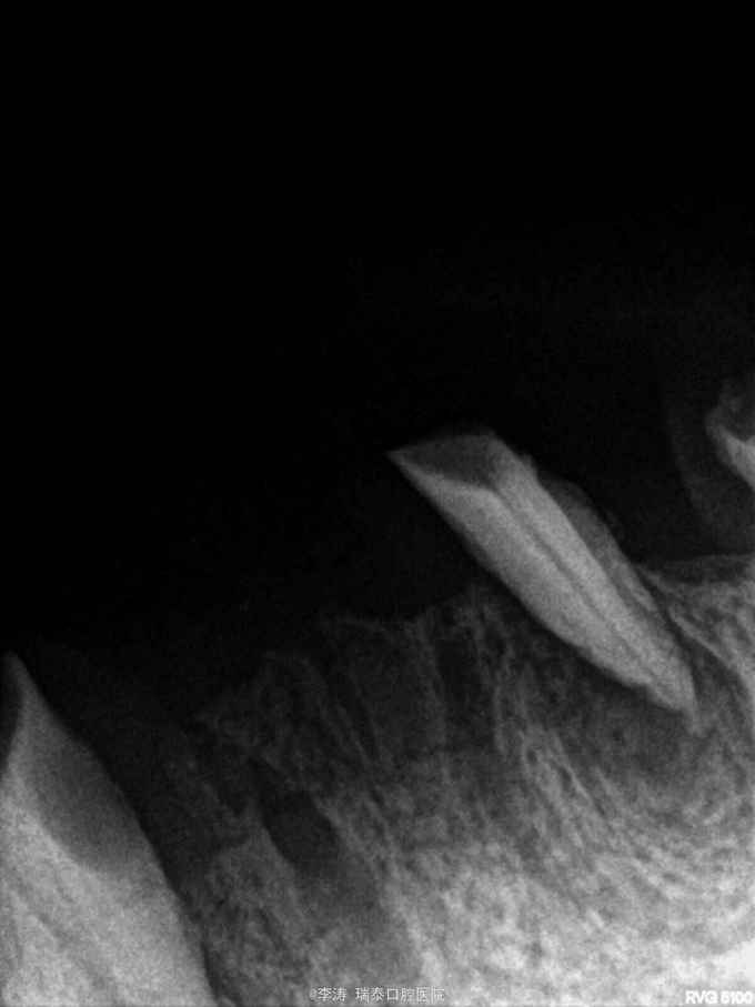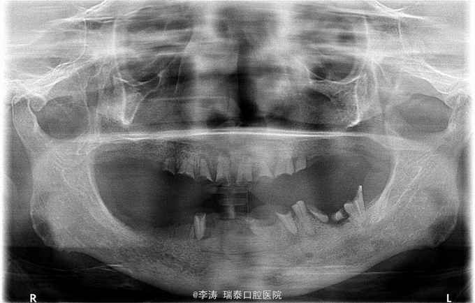 全口大部分牙缺失,上頜4~4残根,下颌32,34,34,36,37,43残根。大部分残根根尖暗影明显。除24,36,43松动III度外其余牙根均不松动