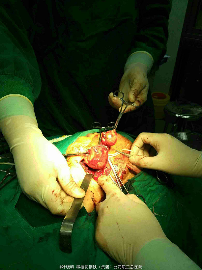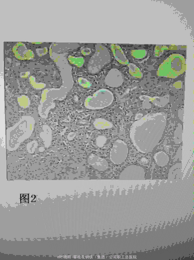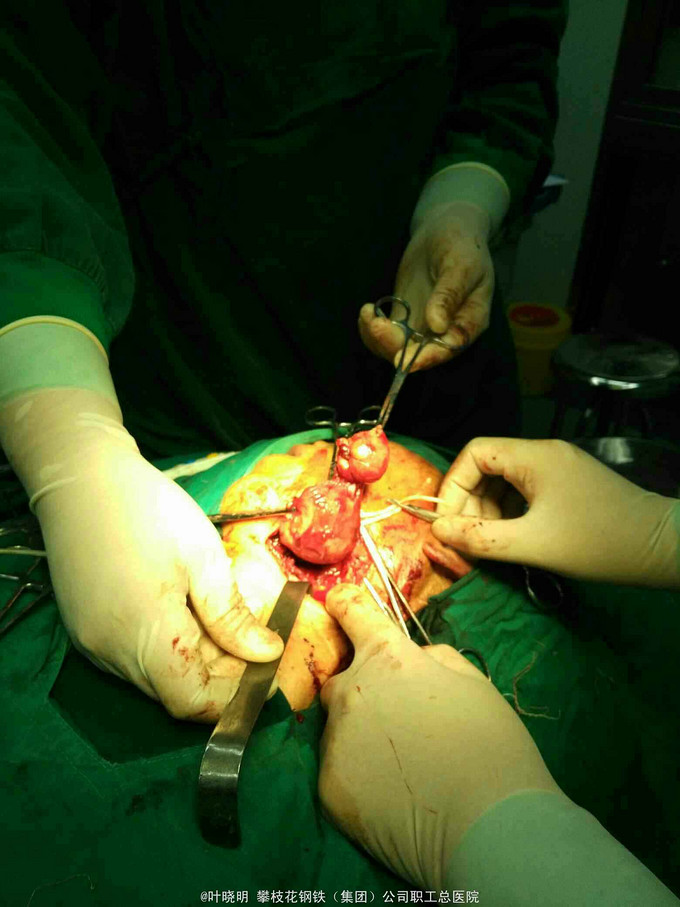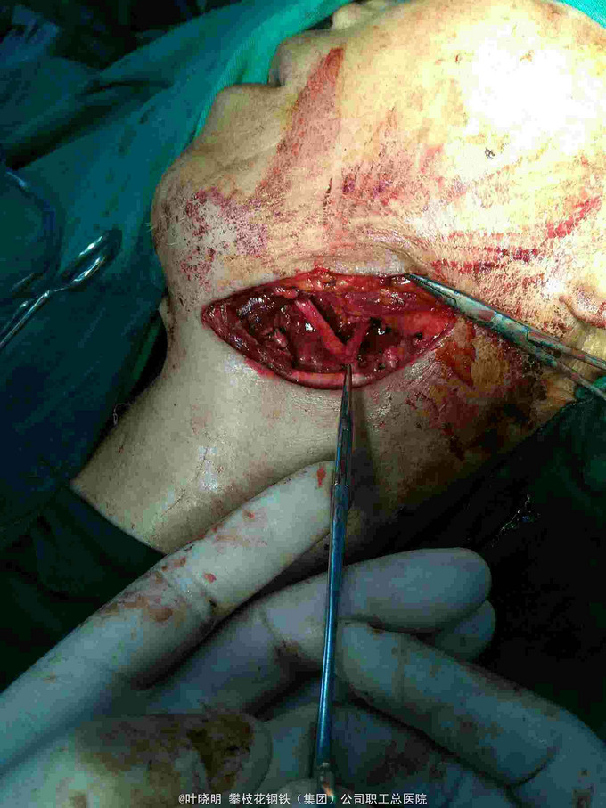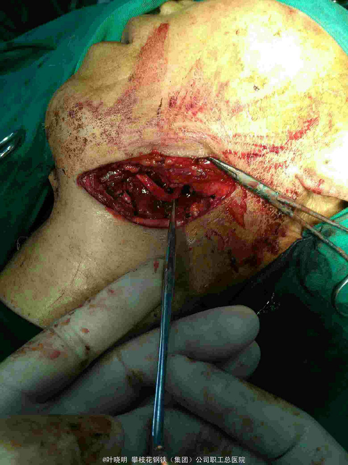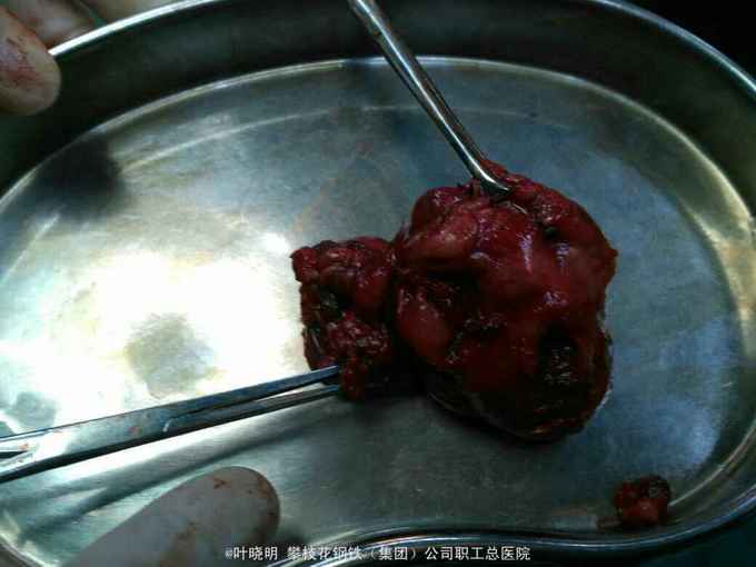 诊断:左颌下巨大包块待诊 1:左颌下腺腺瘤 2:腺瘤恶变? 治疗:2016.03.15上午全麻下常规左颌下切口,切开皮肤、皮下、颈阔肌妥善保护好左面N下颌缘支;拮扎面前Ⅴ和颌外A远心端,摘除面淋巴结,显露二腹肌前、后腹及中间键;见包块与颌下腺融合为一体,抽除出咖啡色内容物约10ml让包块体积缩小使于解剖分离。从前向后纯分离,见舌N袢被挤向浅面,妥善分离并保护之。在二腹肌前腹深面寻找颌下腺导管并近口腔侧拮扎;在二腹肌后腹深面寻找颌外A近心端并双重拮扎之;此时标本已完全游离,完整摘除并送冰冻。 稍后冰冻报告结果为‘’多形性腺瘤‘’。