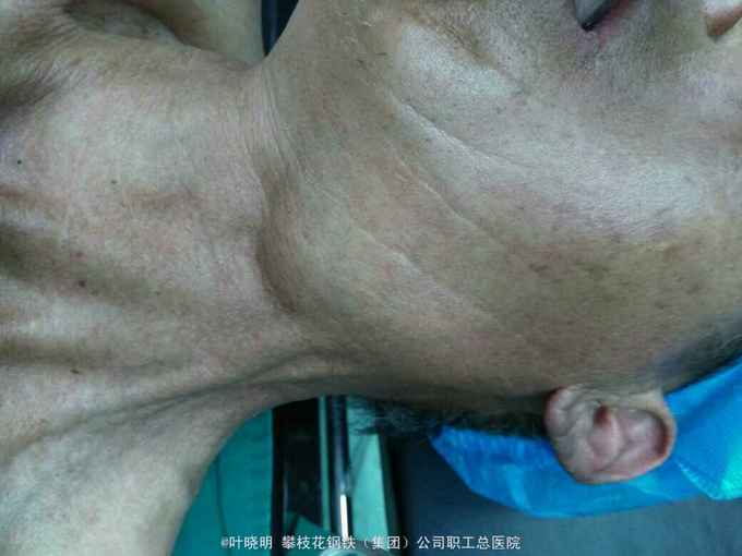 男性,60岁。诉‘’左颌下包块1年余‘’。 无红肿热痛表现,无声嘶、耳鸣、呑咽梗阻及身体消瘦史;抗炎无效,2016.03.08当地县医院B超提示:‘’左颌下混合性占位‘’,建议转上级医院就诊。