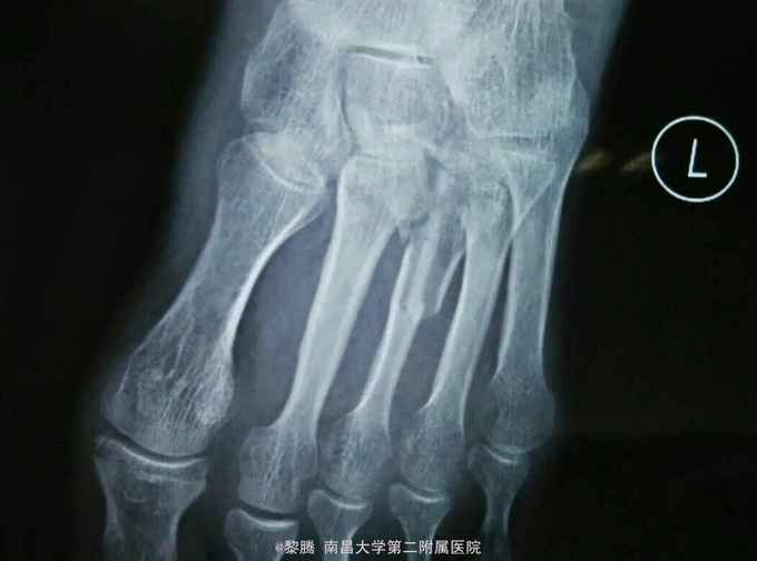 查体:左足肿胀明显,局部皮肤可见明显青紫及张力性水泡,左足背动脉搏动存在,左足各趾感觉无明显异常,肢体末梢血运可 辅查:左足正斜位片提示左第3跖骨骨折。