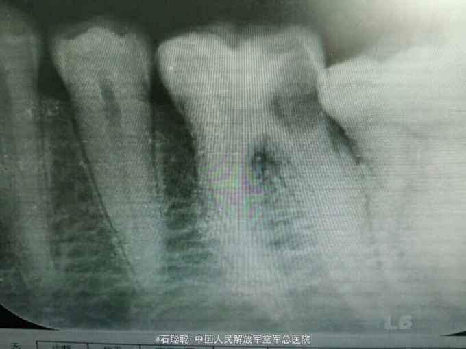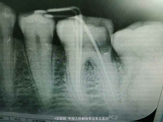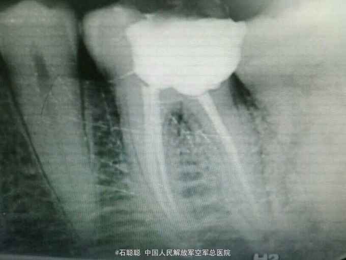 讨论:这是一个典型急性牙髓炎的病历,左下6近中两个根管,远中一个扁形的粗大根管,常规扩大成形后,冷侧压充填,由于远中壁缺损较大,但仍位于龈上2mm,建议全冠修复,恢复患牙咀嚼功能