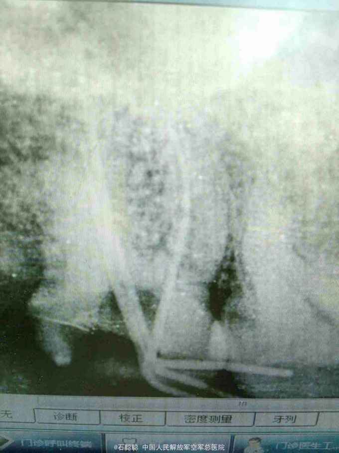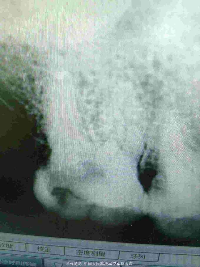 讨论: 右上7远中食物堆积,清洁差是引起龋坏进而发展为牙髓炎的主要原因,远中壁缺损较大,平齐龈缘,常规完成根管治疗后建议患者全冠修复,并且在治疗期间一再强调不能咀嚼硬食,防止患牙劈裂
