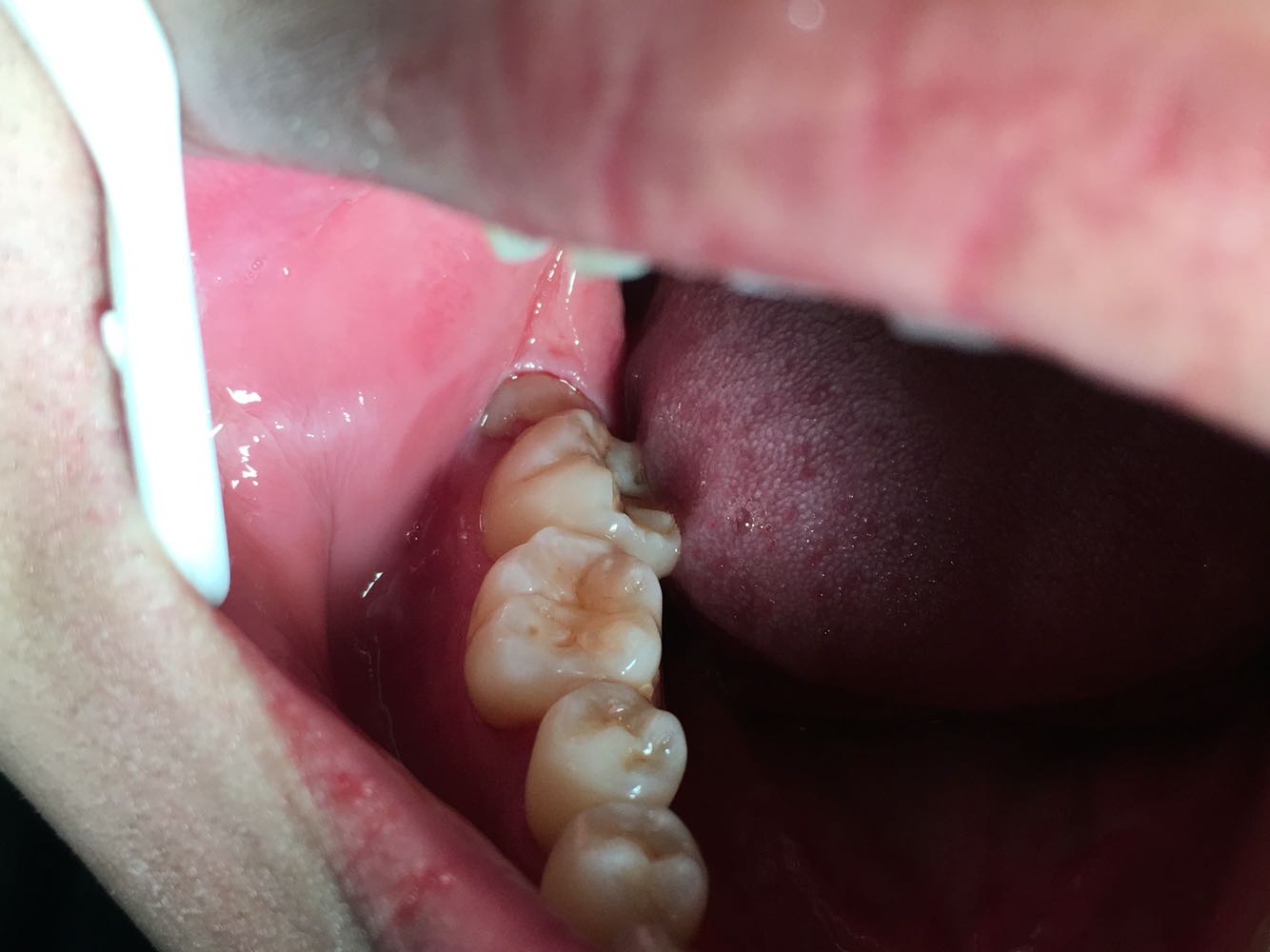 主诉:右下后牙反复肿胀疼痛半年。 病史:右下后牙反复肿胀疼痛,口腔有异味。