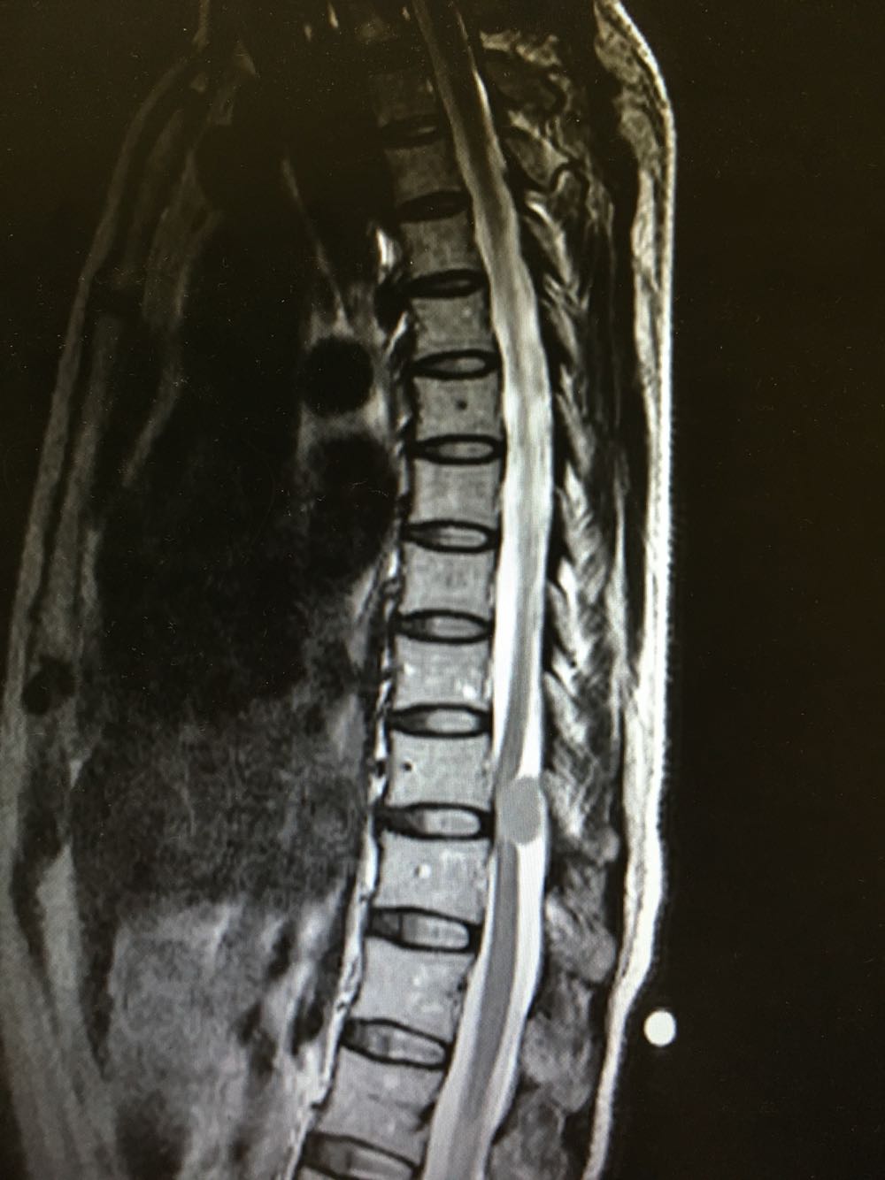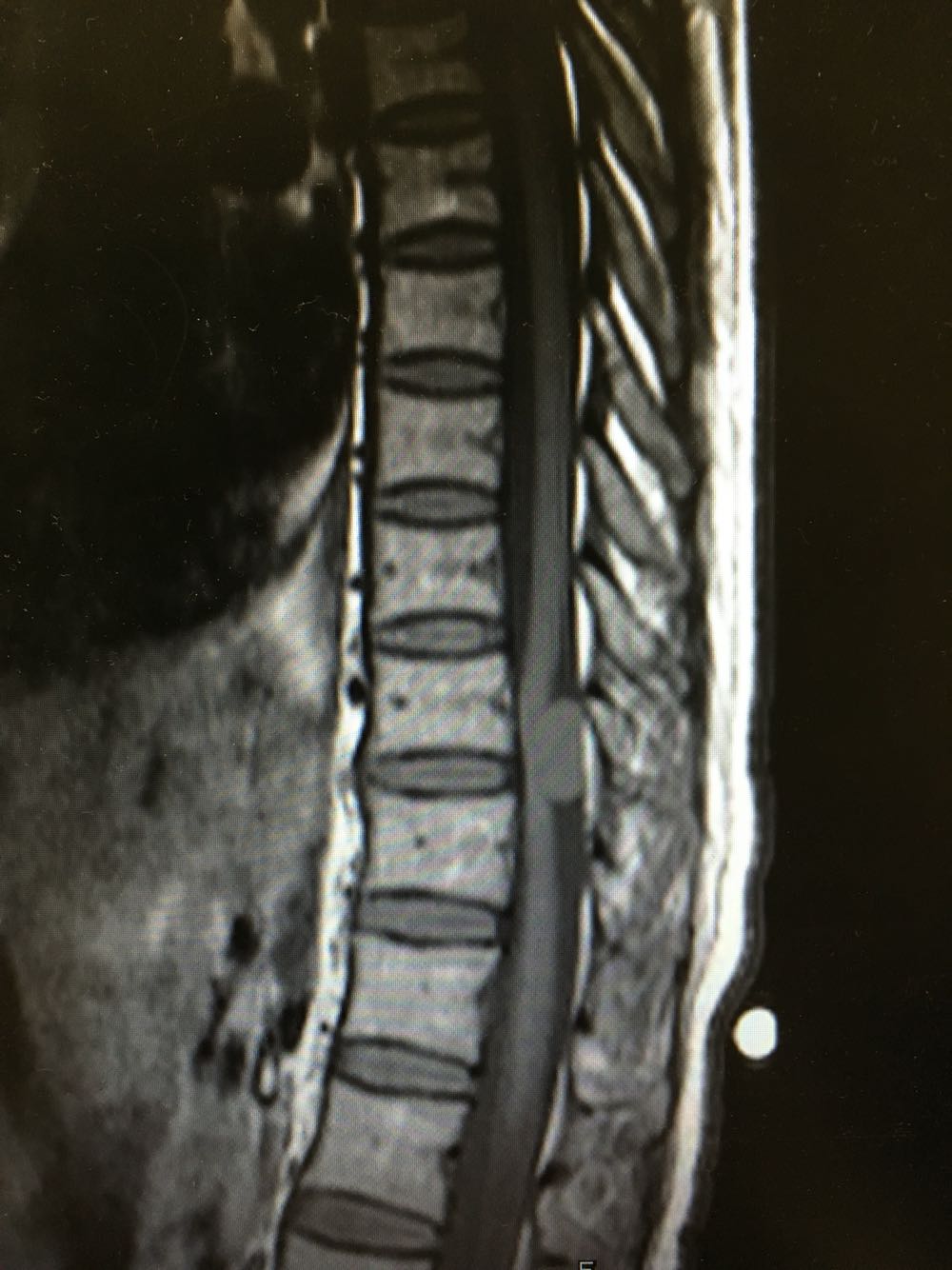 患者,女性,44岁 主诉:进行性双下肢麻木无力1年余 现病史:患者1年前自觉腰痛及脚底脚背麻木不适,至当地医院就诊考虑:腰椎间盘突出,予推拿及针灸治疗,未见明显缓解,症状时有加重,近1周上述症状加重明显,遂至我院就诊,查MR示:T10-11处混杂信号,考虑肿瘤可能,现为进一步诊治收治入院,发病以来,神清,精神可,胃纳夜眠可,二便无殊,体重无明显变化。