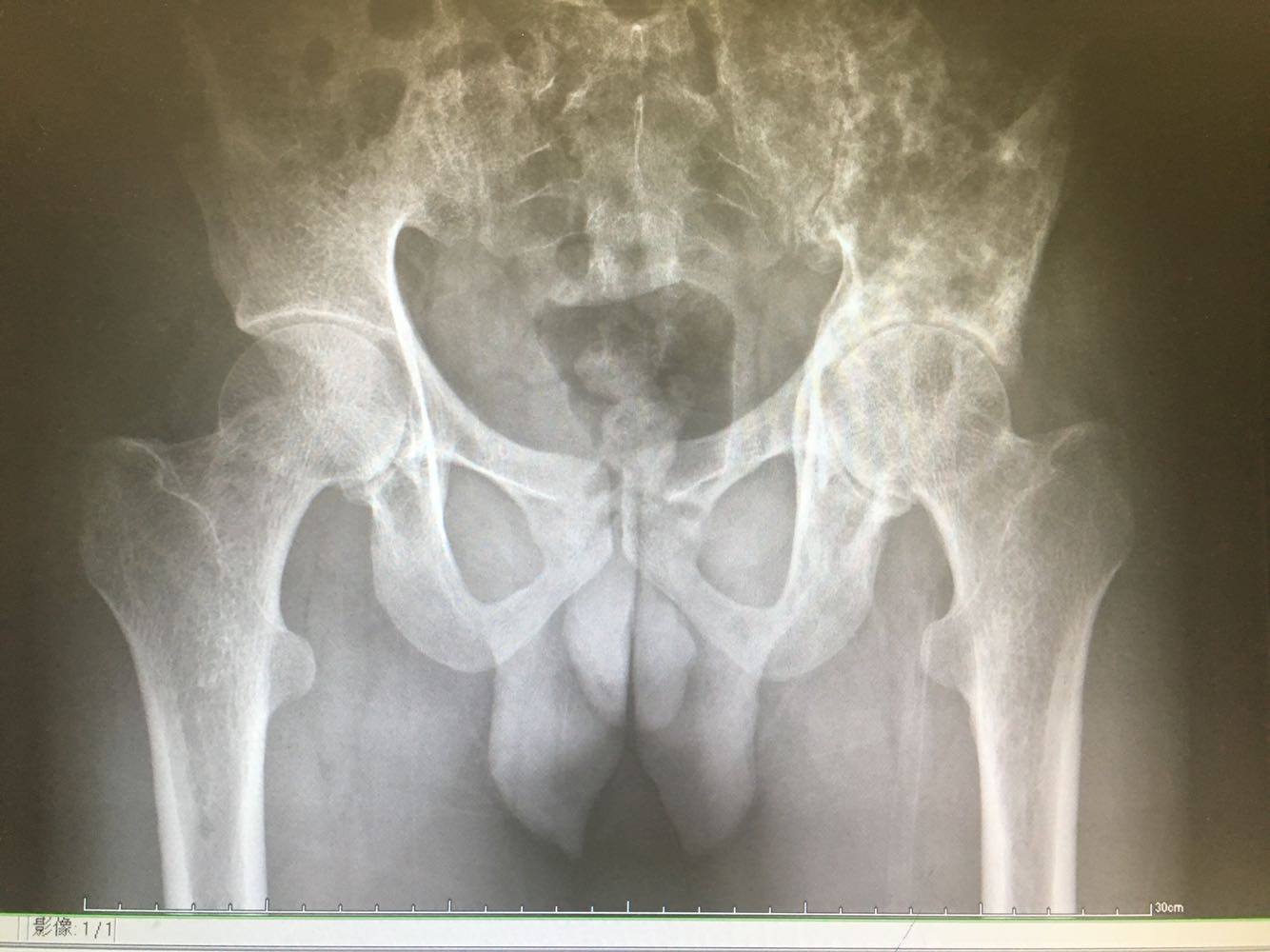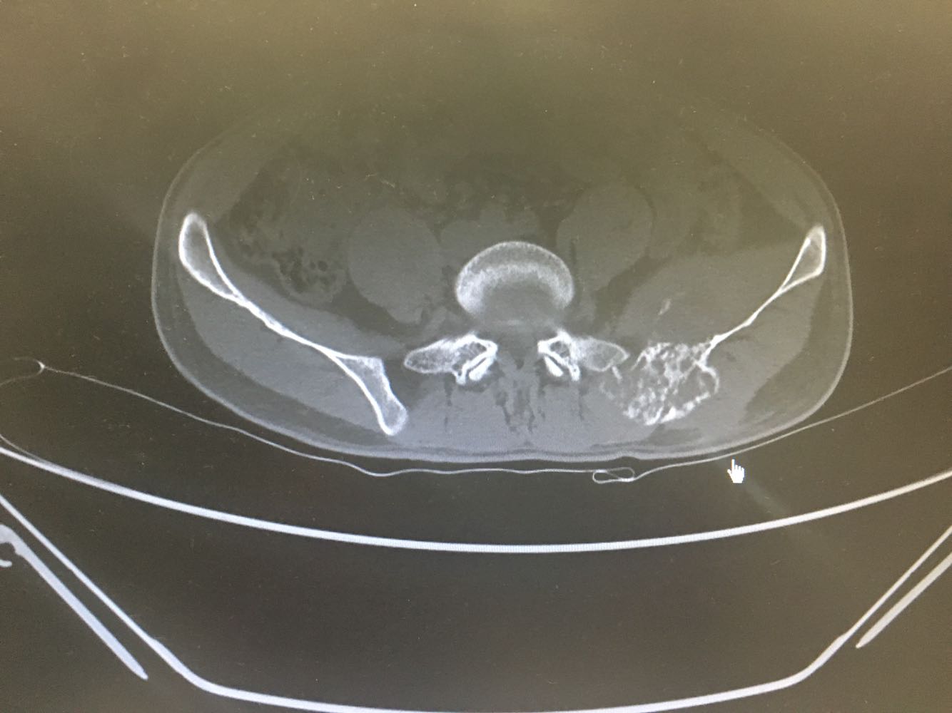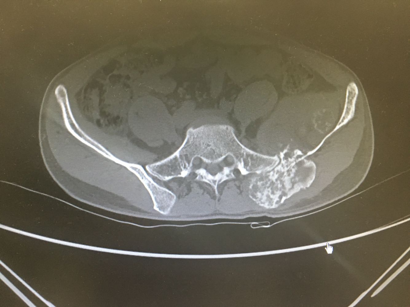 患者,男性,28岁 主诉:左髂疼痛3月 现病史:患者于3月前无明显诱因出现左髂疼痛,行走时加重,休息后缓解,未予重视,1月前发现左腰骶部一质硬肿块,遂至我院门诊就诊,查骨盆X片示:左髂骨骨质改变,现为进一步诊治收治入院,发病以来,神清,精神可,胃纳夜眠可,二便无殊,体重无明显变化。