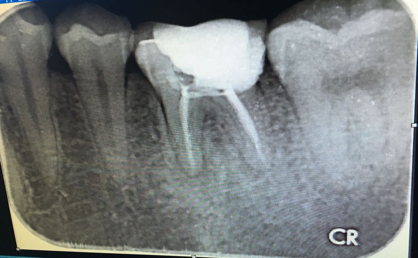 患牙两年前根管治疗,远中根欠充,近颊根管遗漏,根尖片示根尖区无异常,牙体叩痛无,但是想要进行修复治疗牙体治疗必须完善了,所以与患者沟通,此牙进行根管再治疗,观察两周后进行修复术