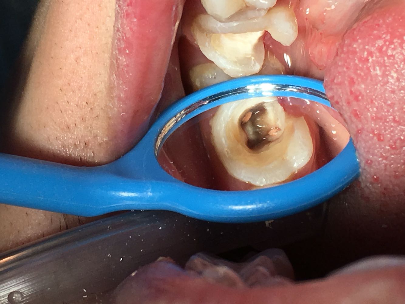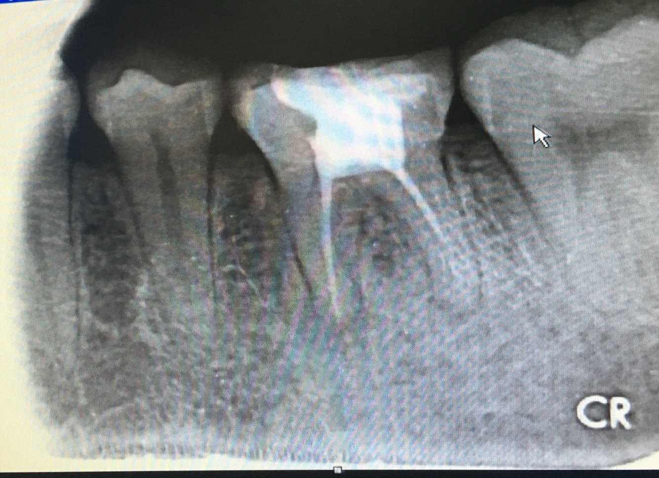 检查:26冠部大面积白色补料,远中轴角处牙体活动撕裂,齐龈,松iii度,剩余牙体组织不松,探痛(-) ,冷水反应(-) ,叩诊无不适,牙齿无松动,牙 龈无充血水肿。X-ray 示:26冠部充填高密度影像,近中遗漏一根管,远中根尖欠填。