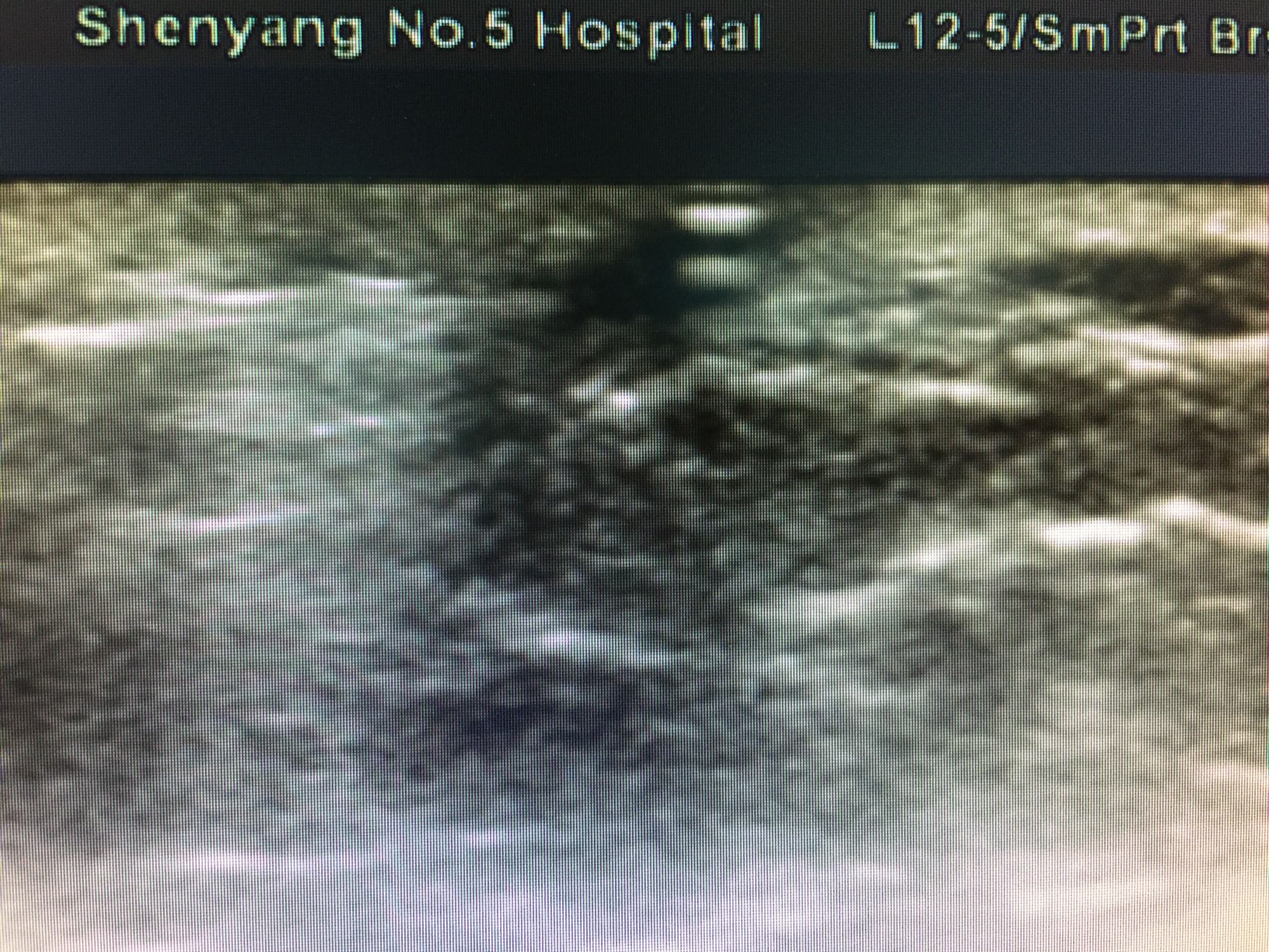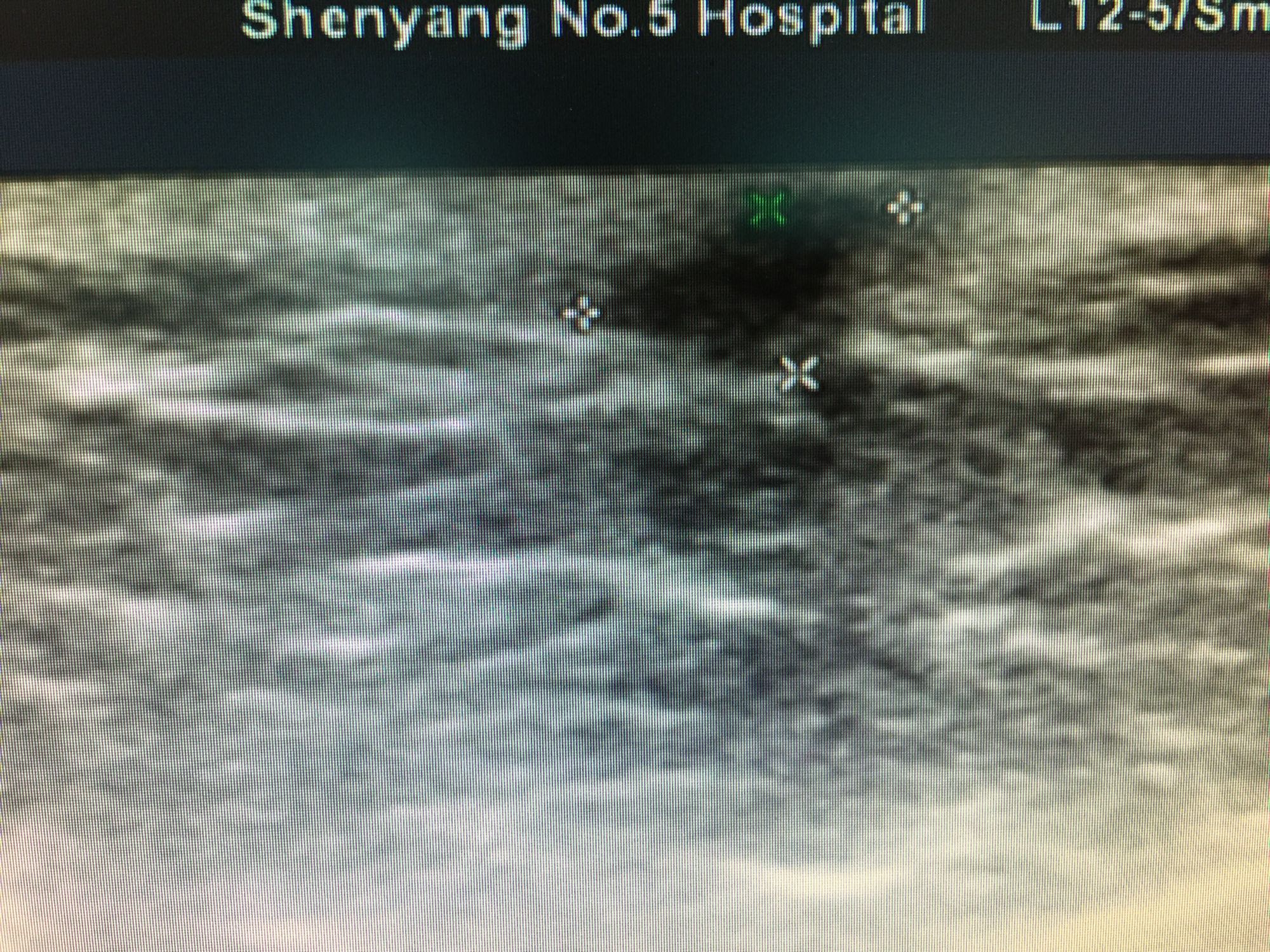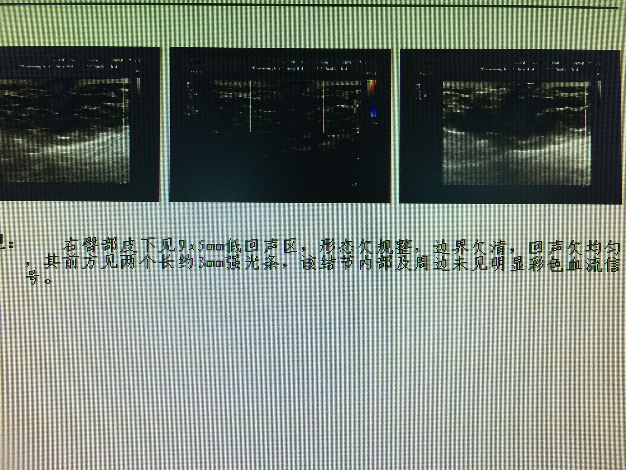 一般状态好;右侧臀部皮肤无红肿,可及皮下肿物约2.0*1.2*1.2cm,质硬,边界清,光滑,触痛明显。B超:右侧臀部低回声伴强光条。
