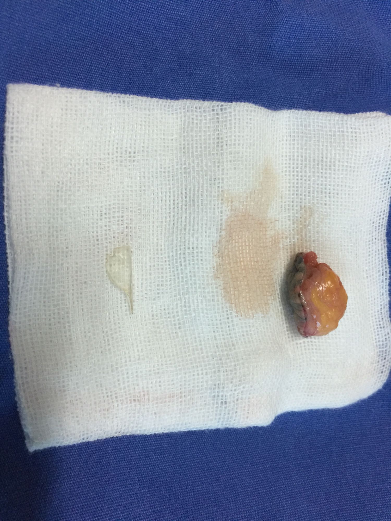 诊断:右侧臀部肿物。 治疗:局麻下取梭形切口将肿物切除,见肿物为瘢痕组织,内含异物为玻璃,不规则,约0.6*0.4*0.3cm。