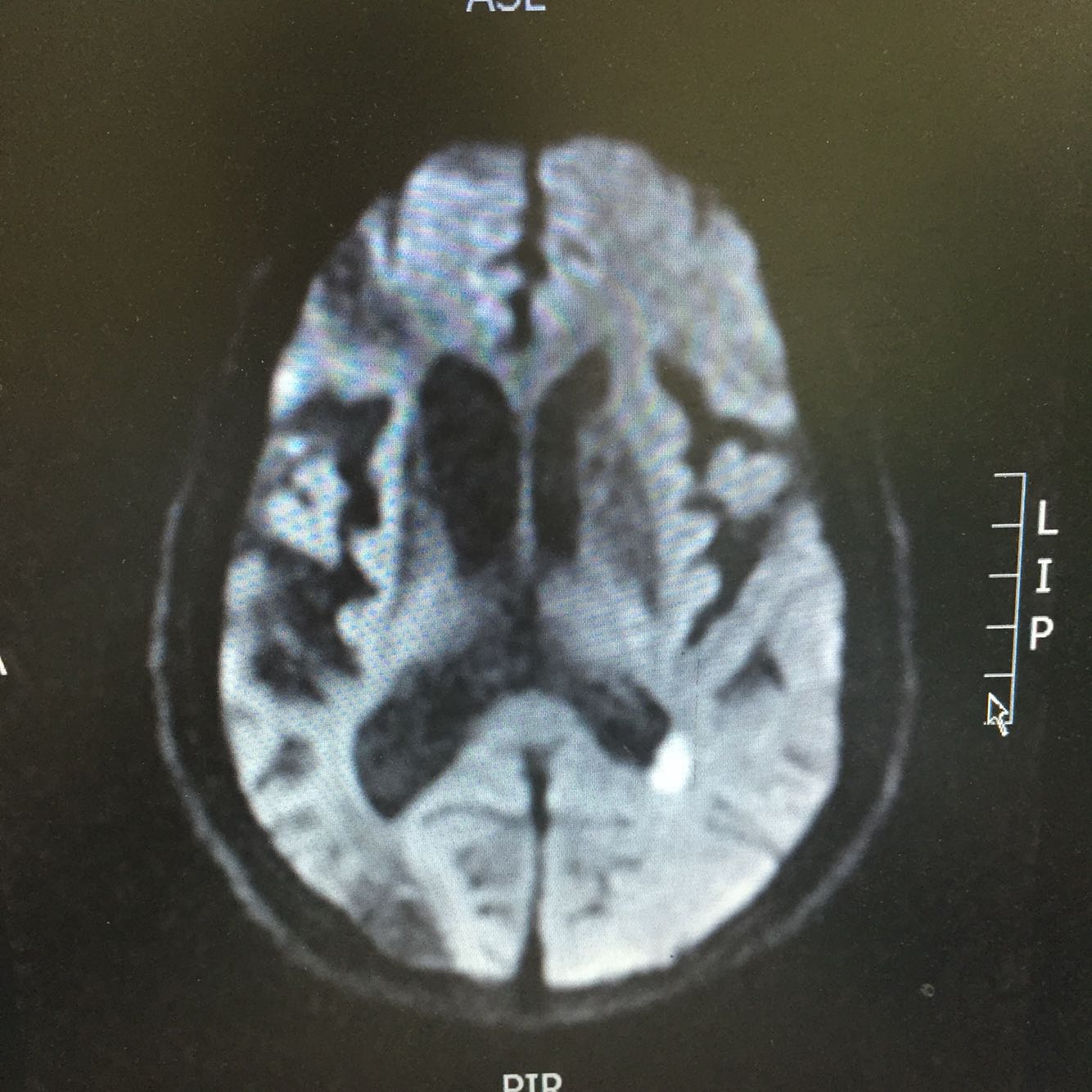 查体:血压110/70mmHg 神志清楚,言语欠流利,查体合作,双侧瞳孔等大同圆,对光反射存在,双眼活动自如,左侧鼻唇沟浅,伸舌居中,左侧肢体肌力4级,右侧肌力5级,肌张力正常,腱反射对称,双侧感觉对称,双下肢Babinski(+)Chaddock(+),颈强(-),克氏征(-) 头DWI示:左侧侧脑室后脚新发梗死。颅内多发占位性病灶,考虑转移瘤