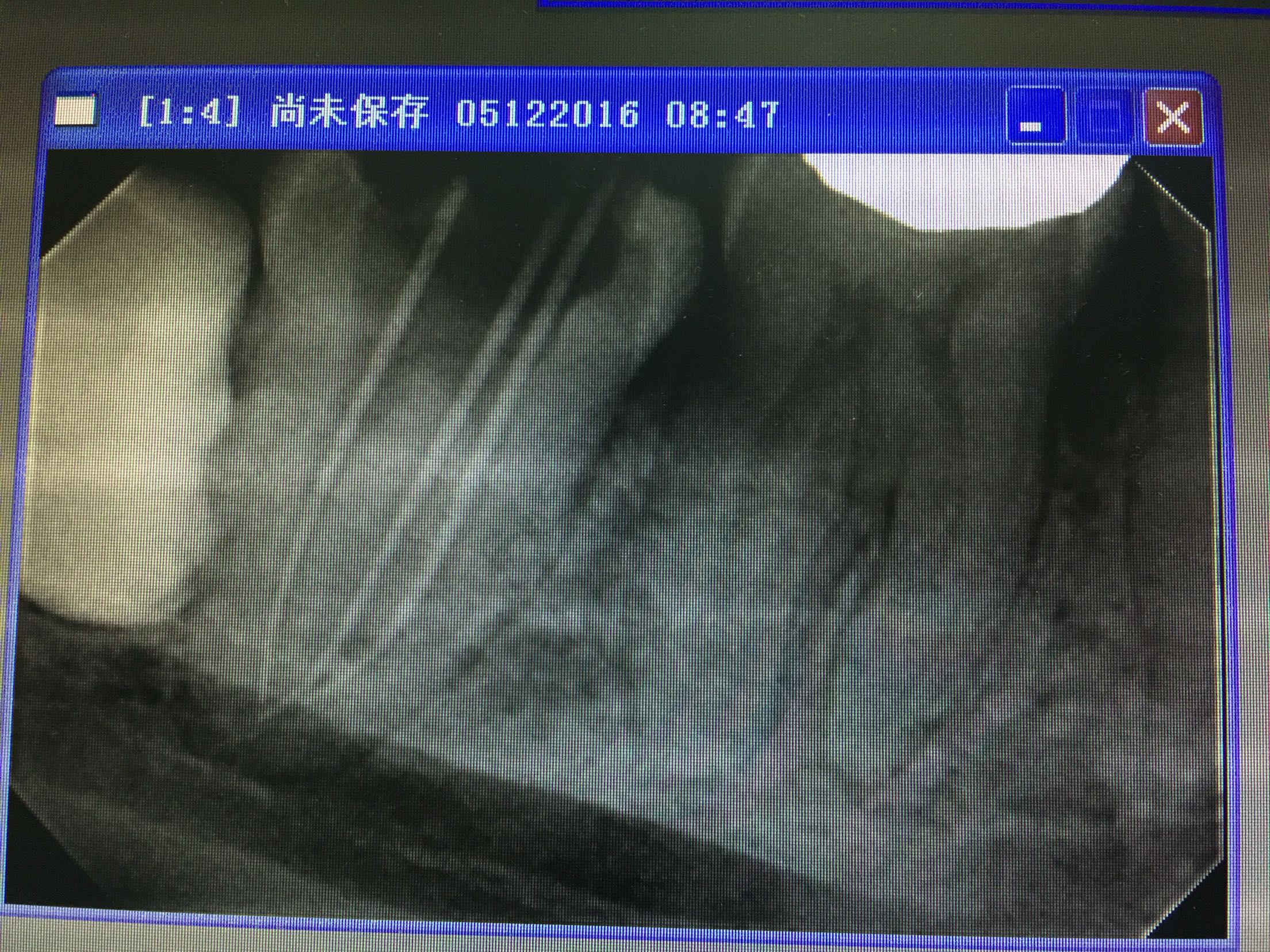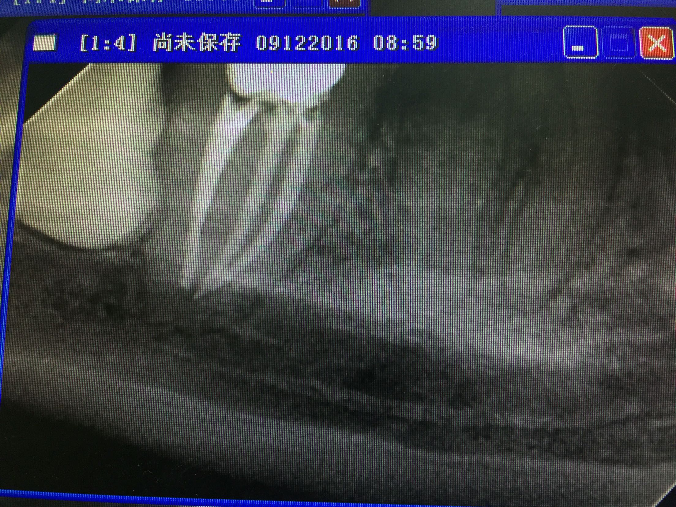 诊断:47牙髓炎 治疗:47局麻下去龋净,开髓揭顶全,拔髓,疏通根管,根管中上段预备,长度测量,waveone根管预备,1%次氯酸钠冲洗,试尖,干燥,根管封药,告医嘱,肿痛随诊? 复诊无不适。47去暂封及根管封药,终末冲洗,干燥,根充,适充,锌基,树脂充填,调合,抛光,告医嘱,建议择期冠修复。