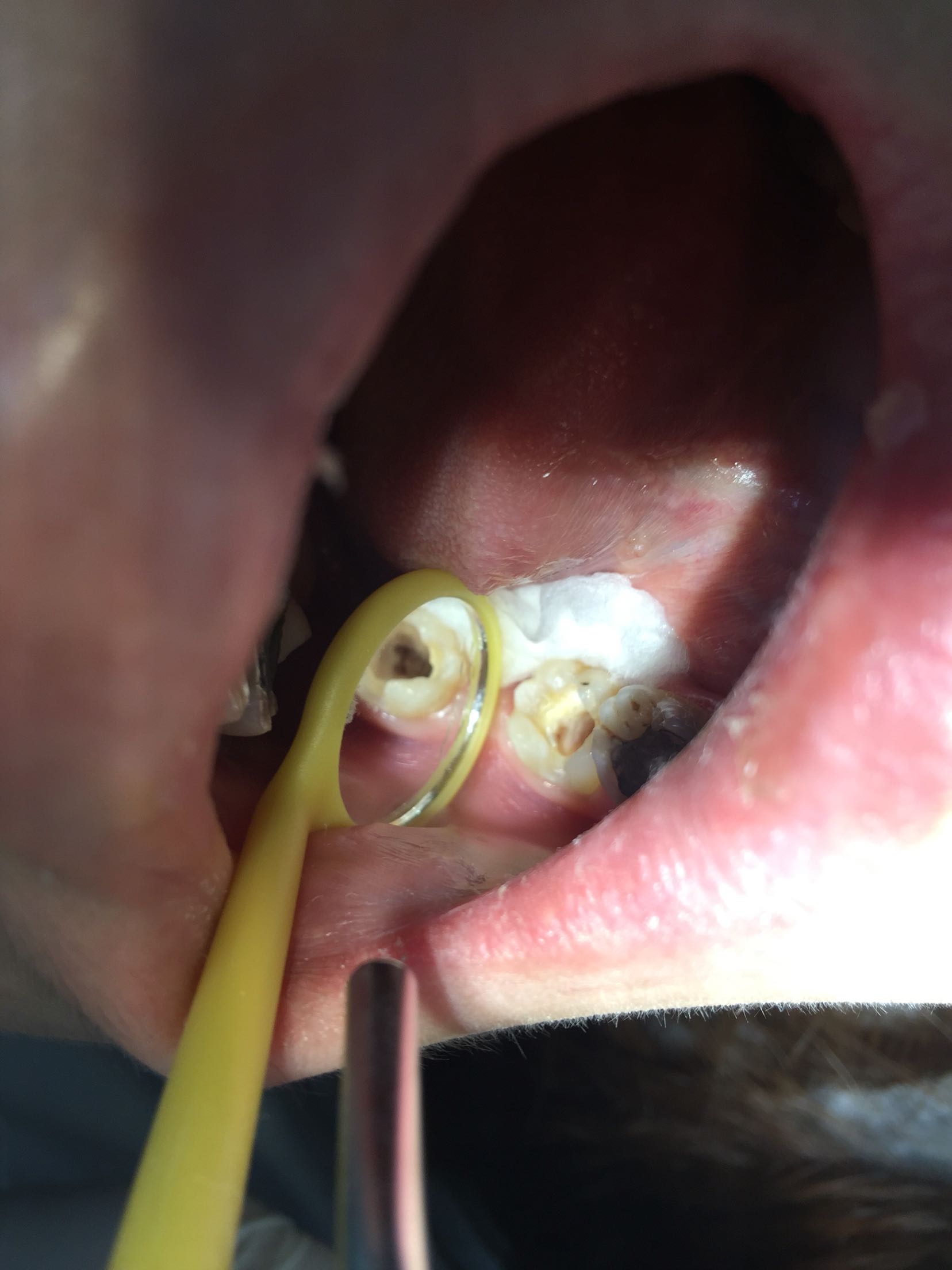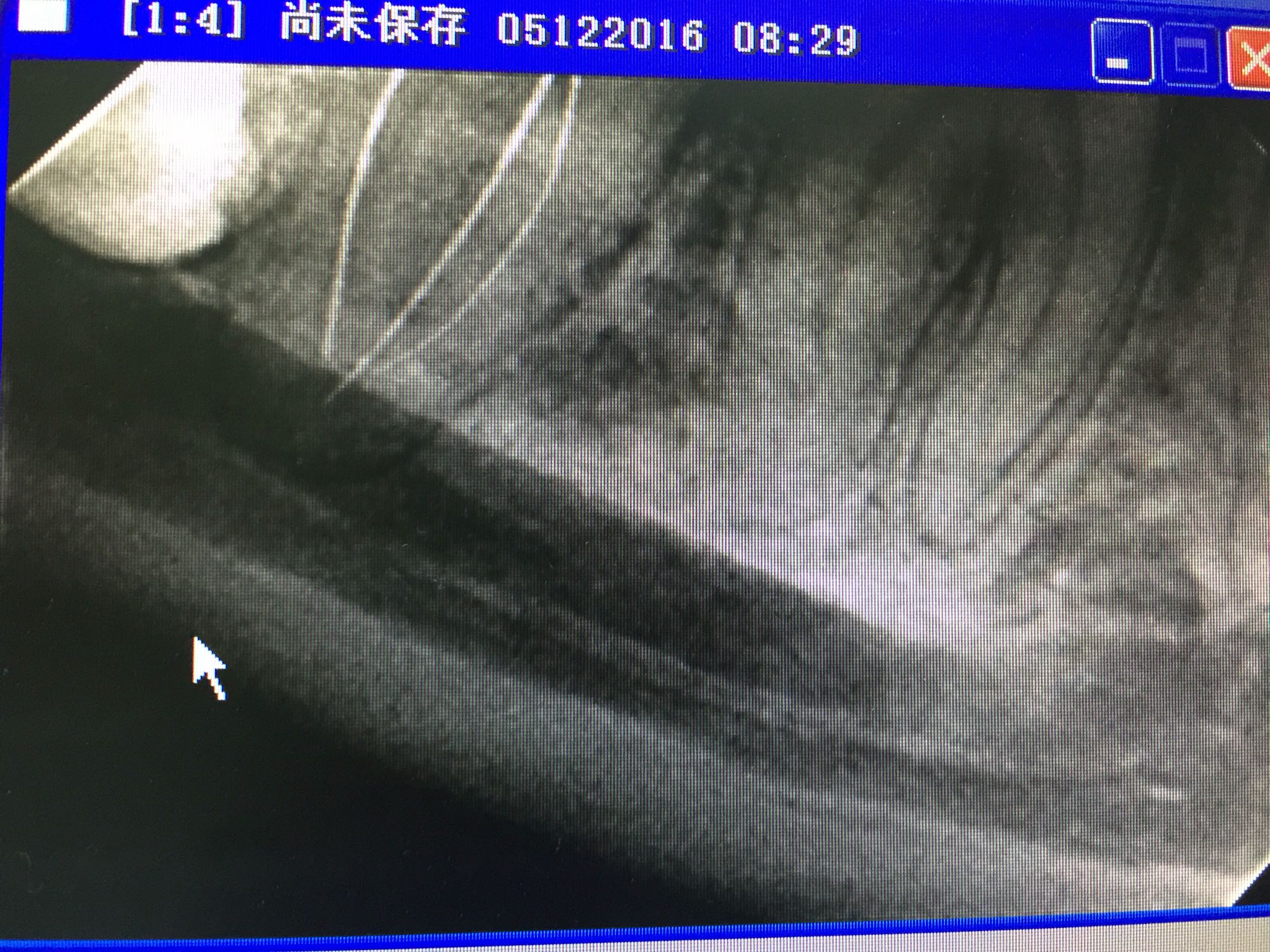 检查:47颊合面深龋,探及穿髓点,探诊(+),叩诊(+-),松动不明显,牙龈无明显红肿,冷诊(++)。辅查:47合面低密度影像及髓。