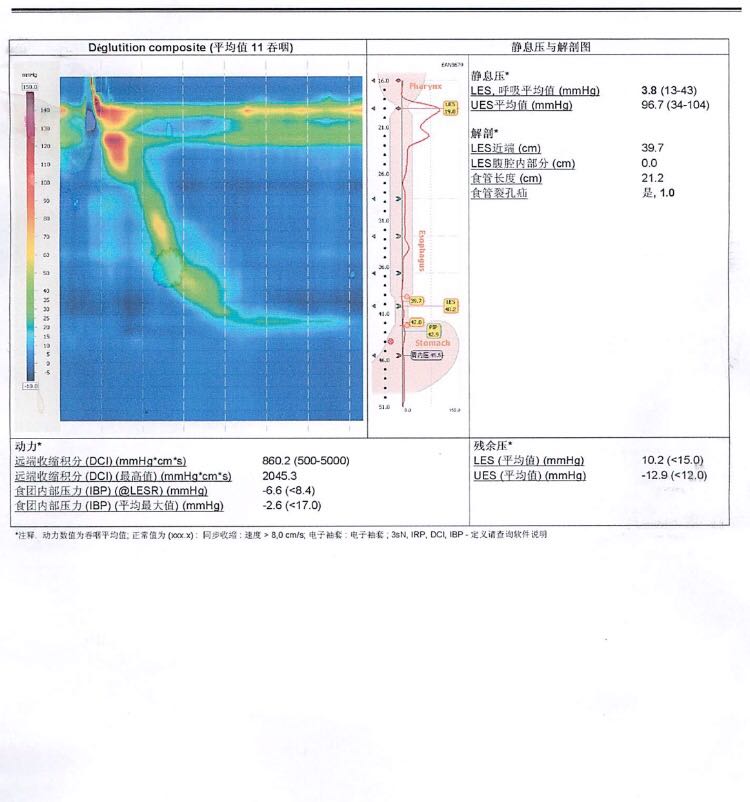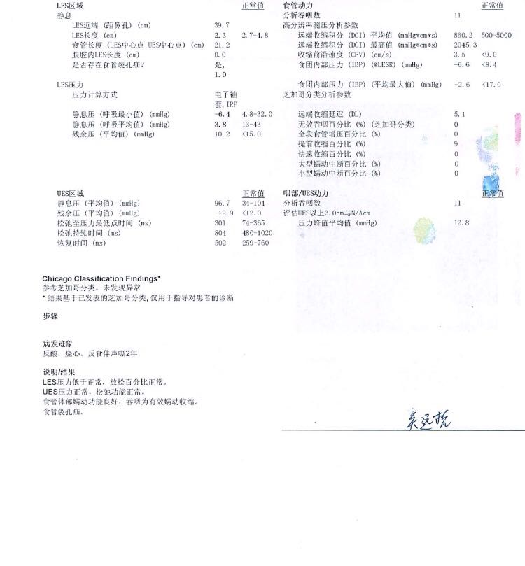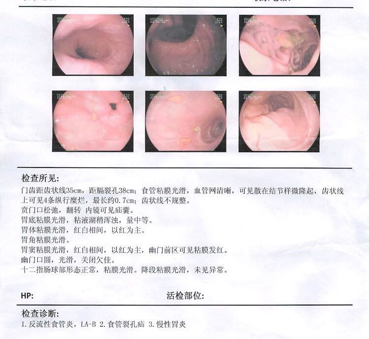 诊断:1.胃食管反流病1.1.反流性食管炎LA-B2.食管裂孔疝3.慢性胃炎 治疗:腹腔镜下食管裂孔疝修补术+Nissen 胃底折叠术