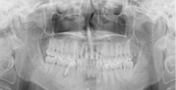 右侧下颌第二前磨牙叩痛,松动度可。余未见异常。曲面断层片提示右侧下颌第二前磨牙根尖密度减低,髓腔内可见根充物质,