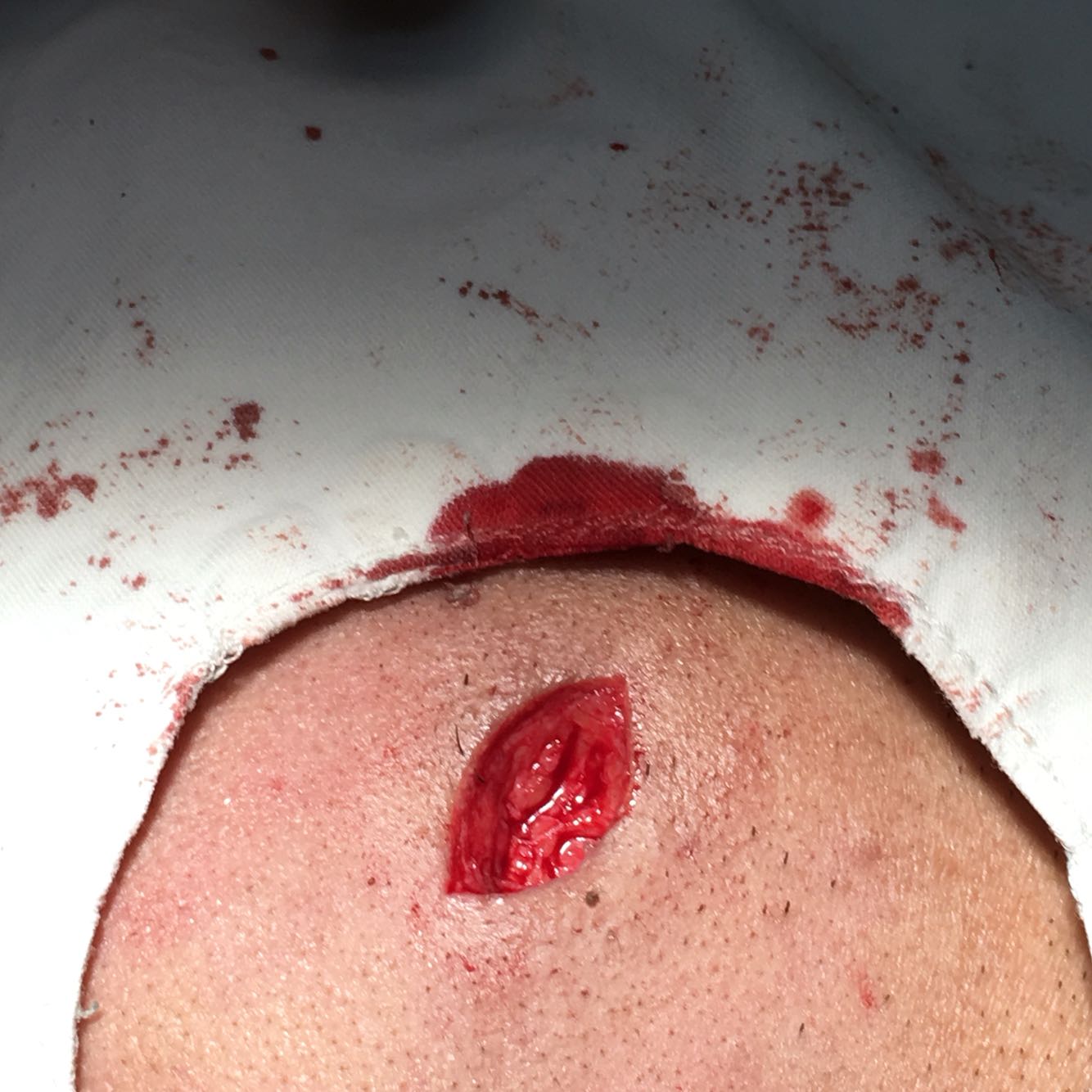 切开引流术后1个半月余,要求手术。 3年前,面部右侧皮下可触及一无痛性包块,逐渐增大,无疼痛,3周前突然增大,轻压痛,未治疗,一周来复诊,建议抗炎治疗后择期,1天前破溃,面部右侧皮肤可见一直径3cm大小包块,中心可见一黑色素点,表面皮肤红,局部破溃,可见少量脓性分泌物溢出,与皮肤粘连。予以皮脂腺囊肿切除引流术。