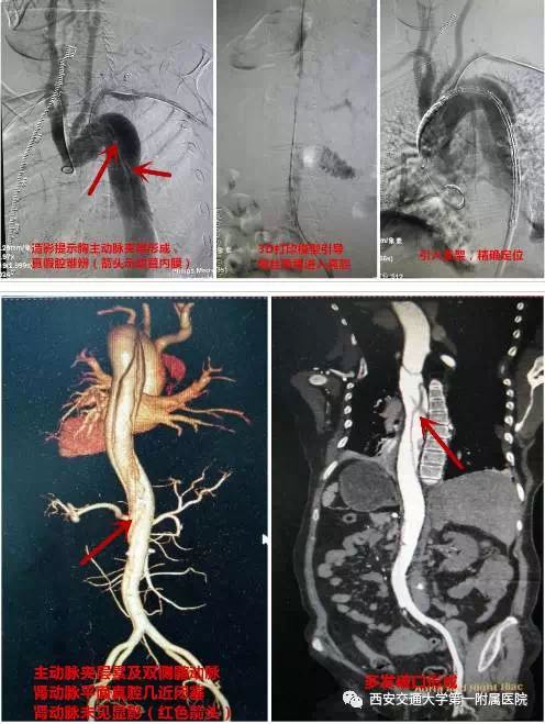 患者入院后立即予以吸氧、镇痛、镇静、稳定血压、预防感染等治疗,缓解症状及防止病情进展。同时针对该复杂病变,立刻组织病案讨论,并创新性的提出利用3D打印技术,1:1复原病变主动脉,进一步明确动脉破口位置、大小及程度,并以此作为手术引导。血管外科蔡惠住院总医师积极协调,于最短的时间内取得主动脉3D打印模型。3D打印的胸腹主动脉模型完美呈现出所有病变的特点,并提示最佳的手术入路及真腔走形。随后,在介入手术室及血管外科护理团队的配合下,经过精心地术前准备,以娴熟的手术技巧,仅用半小时就顺利完成该例复杂胸主动脉夹层腔内修复术,术中即显示几近闭塞的真腔重新开放,一侧肾动脉重新恢复血流灌注。术后患者恢复良好,术后第2天即有排尿,且尿量进行性增加,至患者出院时,尿量已增加至500-600ml。