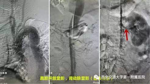 入院后行CTA检查提示主动脉夹层Stanford B型,累及双侧髂动脉,多发破口,真假腔形成,且假腔扩张压迫真腔,导致真腔变窄,肾动脉水平腹主动脉真腔几近闭塞,双侧肾动脉无血供,这也是导致患者无尿、肾功能急性衰竭的原因。