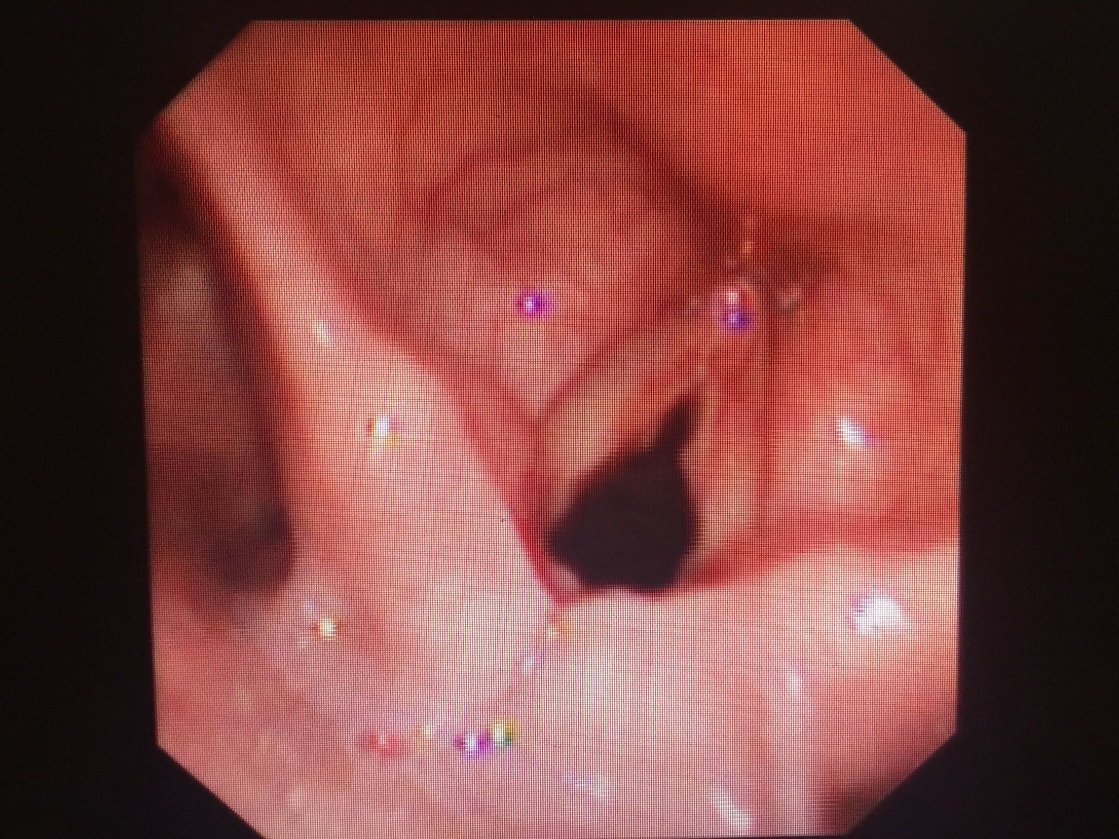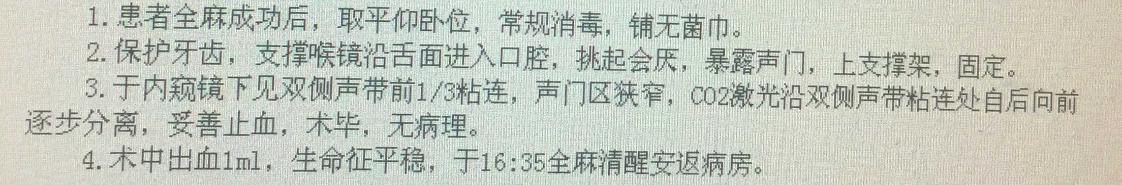诊断:声带粘连。治疗:入院后完善辅助检查,全麻支撑喉镜下行CO2激光声带粘连分解术。