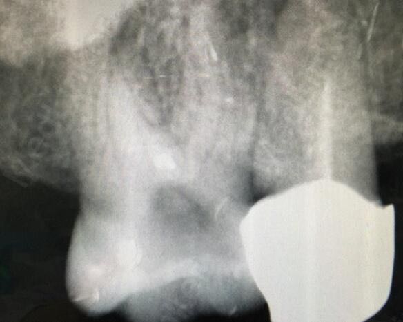 16牙可见腭侧龋坏,可探及穿髓孔,冷(+-)叩(+-)探(++) X线示龋洞近髓,牙周膜增宽影像