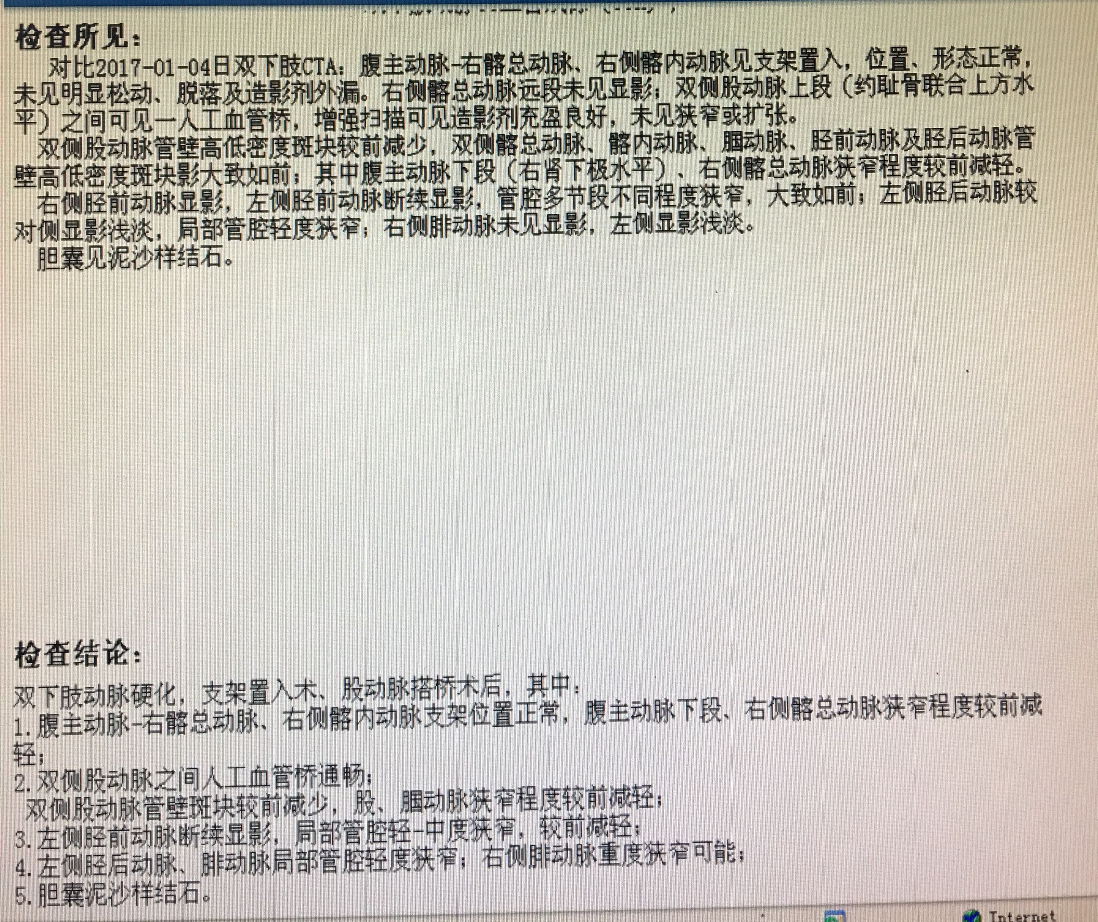 诊断: 1、双下肢动脉硬化闭塞症 2、高血压3级 很高危 3、左侧顶叶多发脑梗死 4、胃幽门螺杆菌感染 治疗:介入室局麻下行腹主动脉造影+球囊扩张+右侧髂总、髂外动脉支架植入术 ,于腹主动脉-右髂总动脉植入10×80mmBRAD支架一枚,于右髂外动脉近端右髂内动脉开口以下植入6×60mmBARD支架一枚,再次造影:腹主动脉、右髂内、外动脉显影,血流满意,无内瘘形成。左侧髂总动脉未显影。 术后患者右下肢皮温改善,左下肢无明显改善,介入术5天后在手术室静吸复合全麻下行左股动脉内膜剥脱术+股股人工血管搭桥术。手术后双下肢皮温明显转暖,足背动脉可扪及。