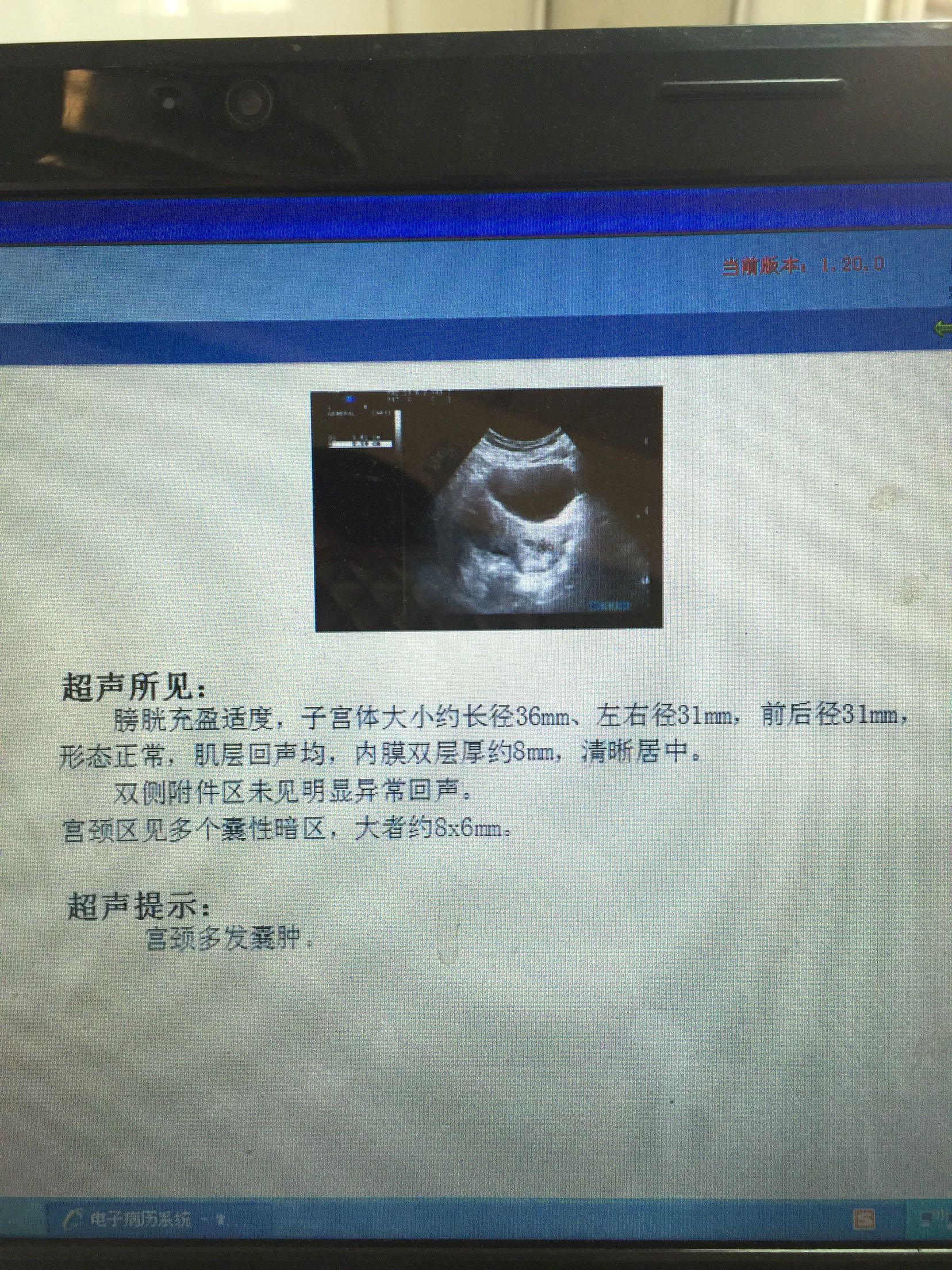 查体见阴道后壁陈旧性裂伤达直肠黏膜,部分直肠黏膜外翻,宫颈肥大,宫颈口处见一约1*3cm大小息肉,宫体后位,正常大小。