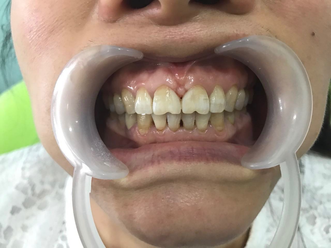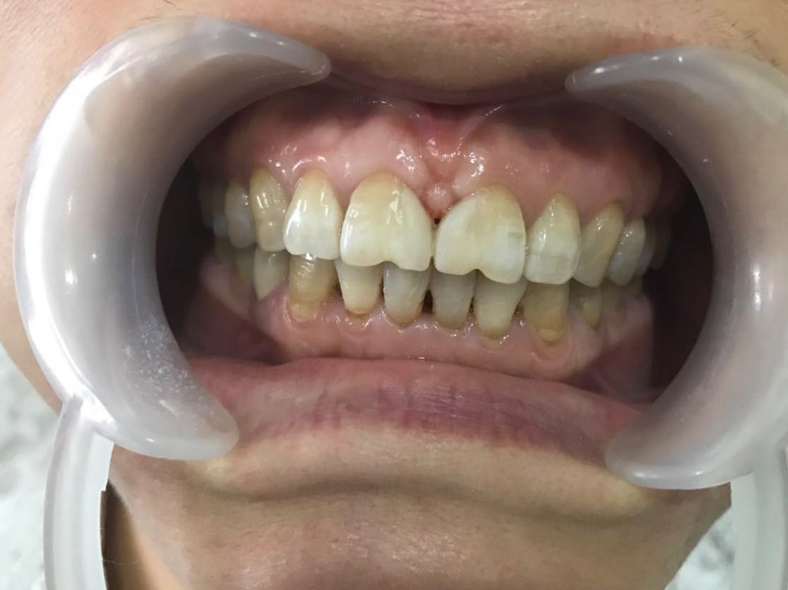 检查上前牙11,21之间缝隙宽大。约2mm,曾在外院修复过,现已脱落!
