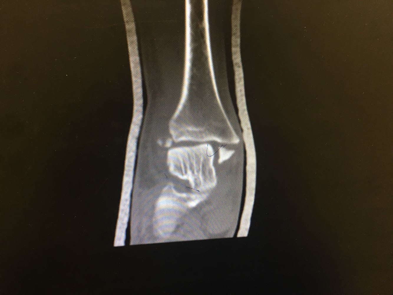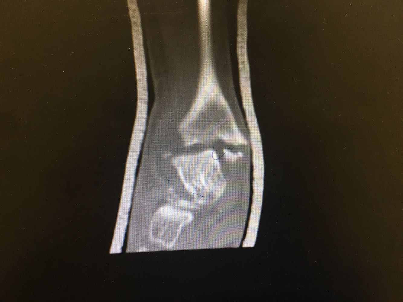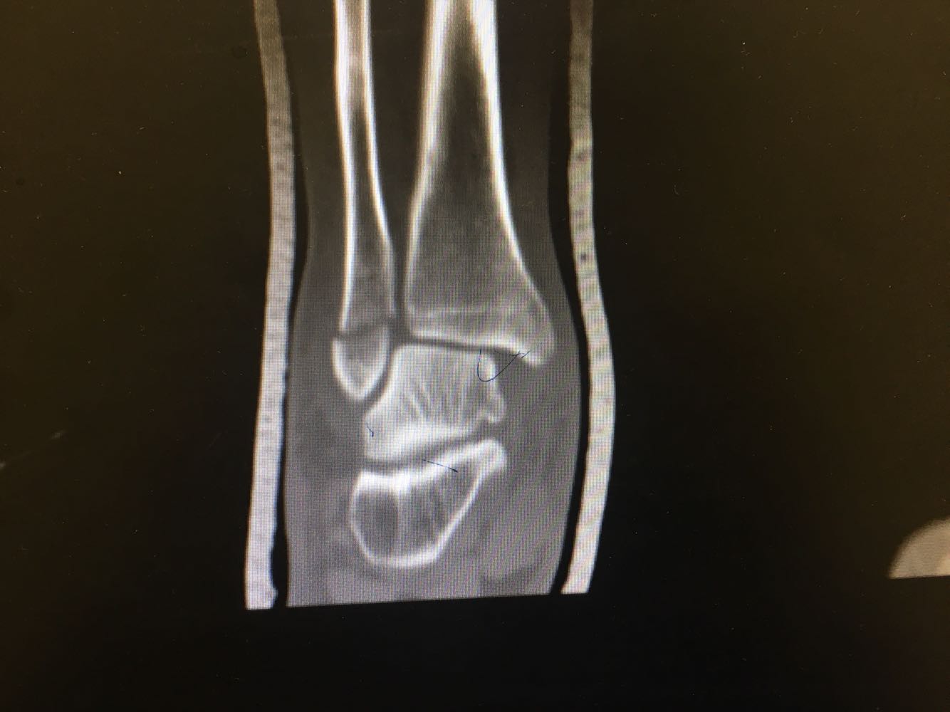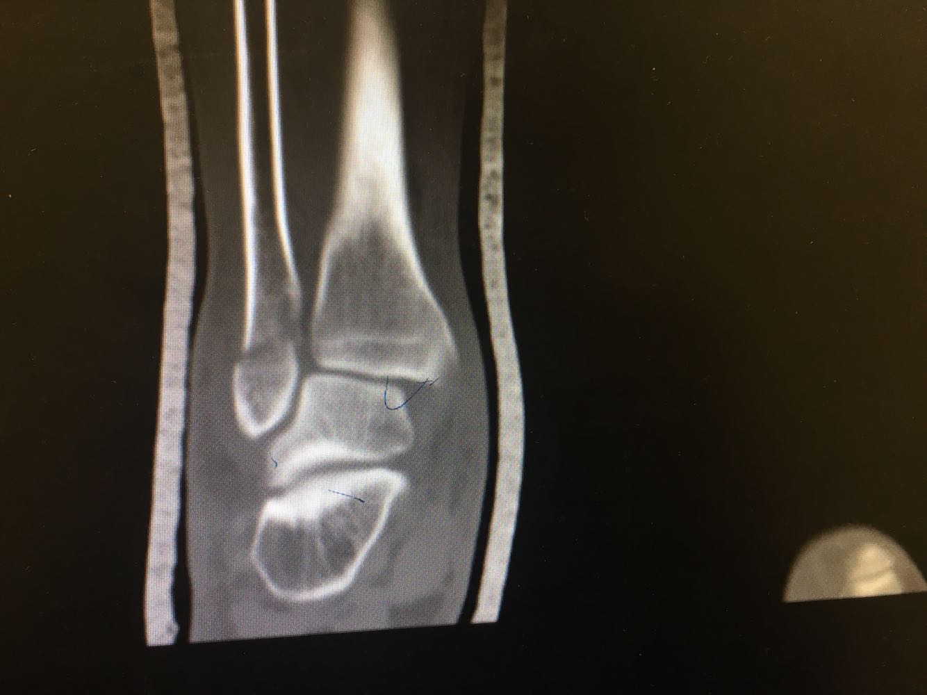 查体:右踝压痛,活动受限,无淤斑淤点,未见皮肤破损,足趾感觉及运动良好。 辅检:右踝部CT