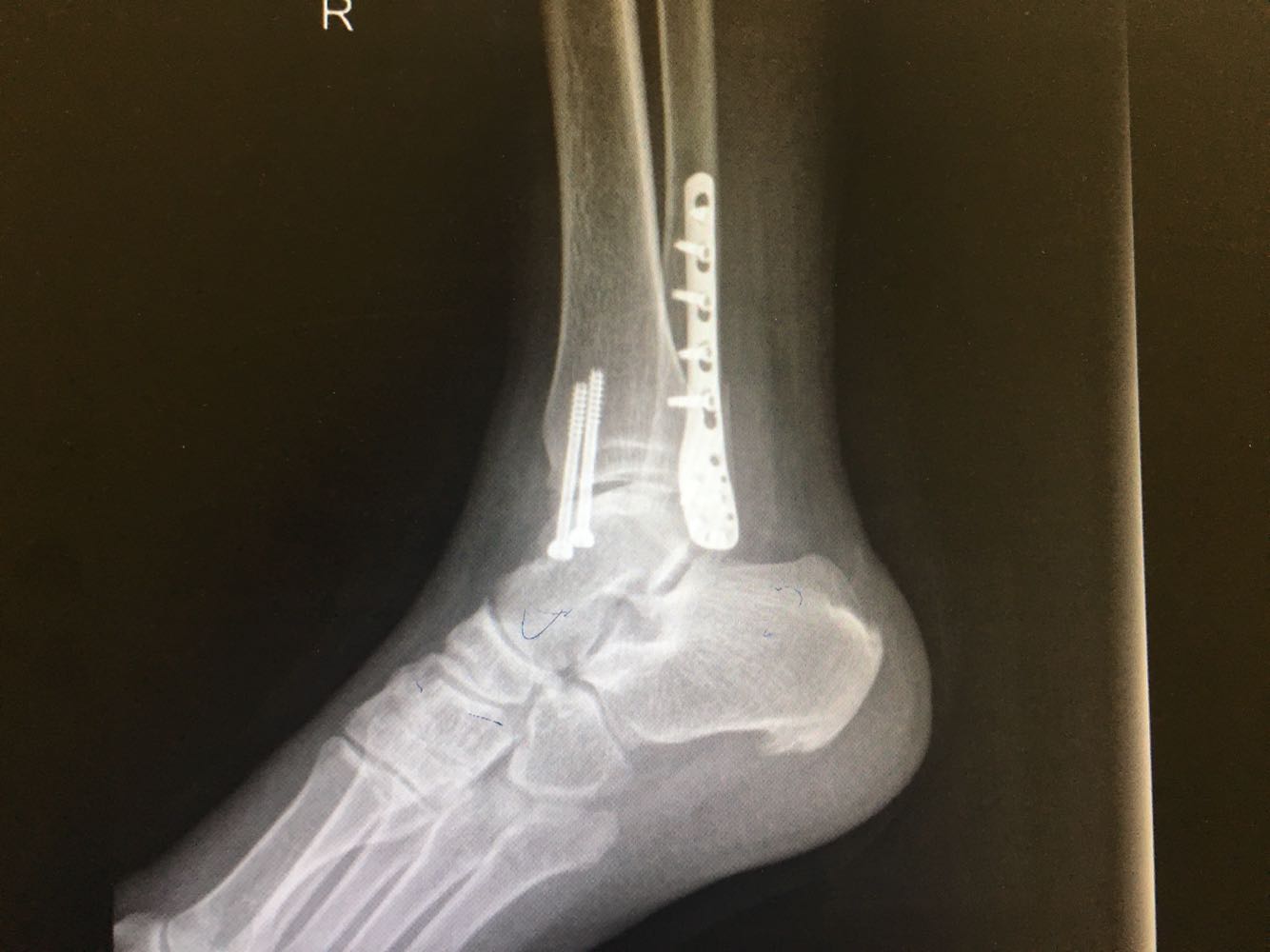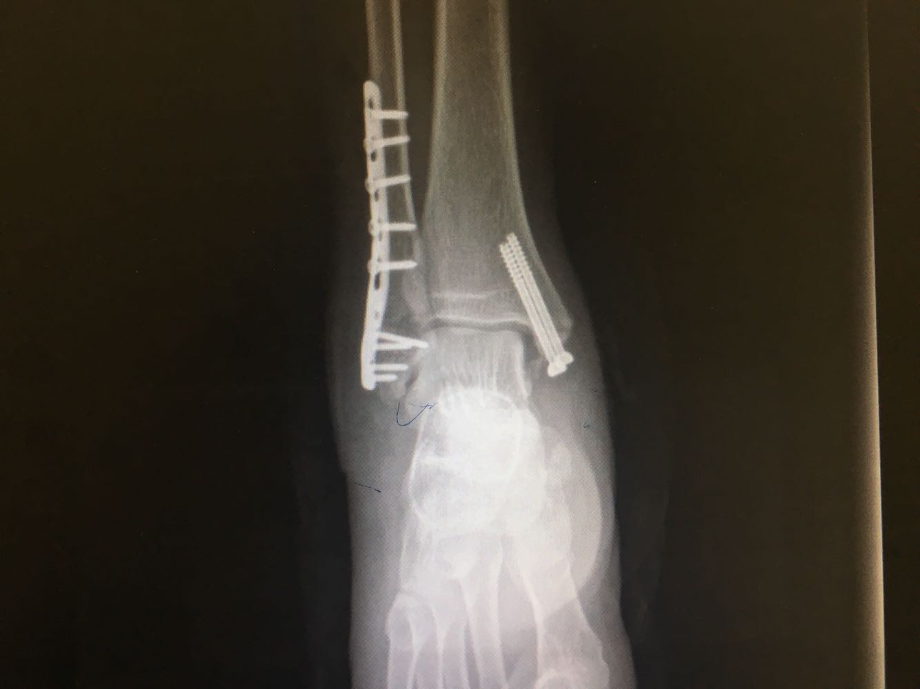 诊断:右侧踝部闭合性骨折 治疗:完善术前检查后行手术内固定