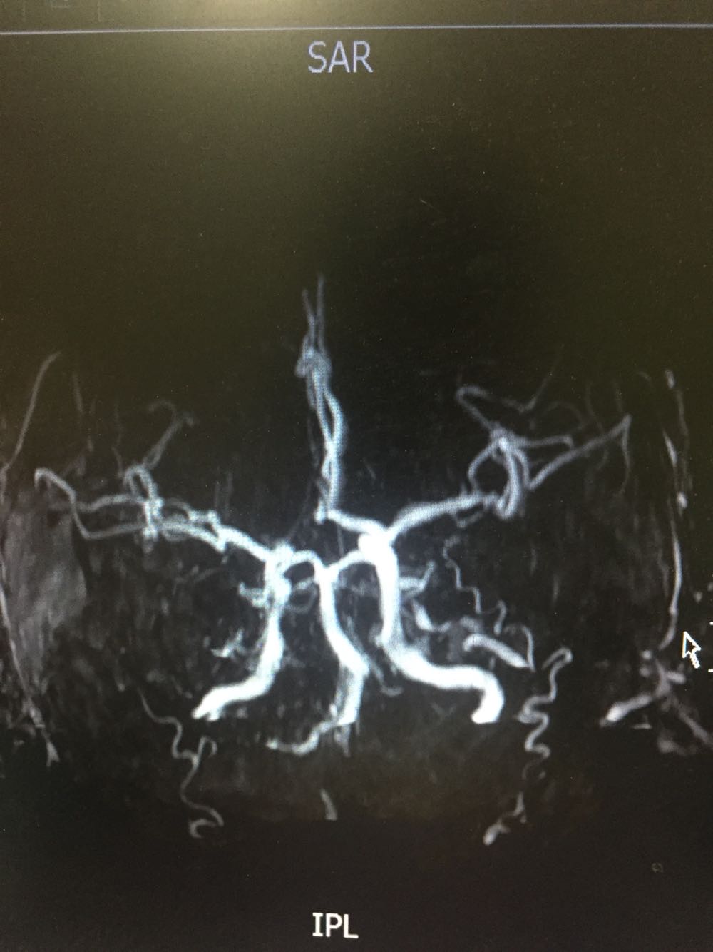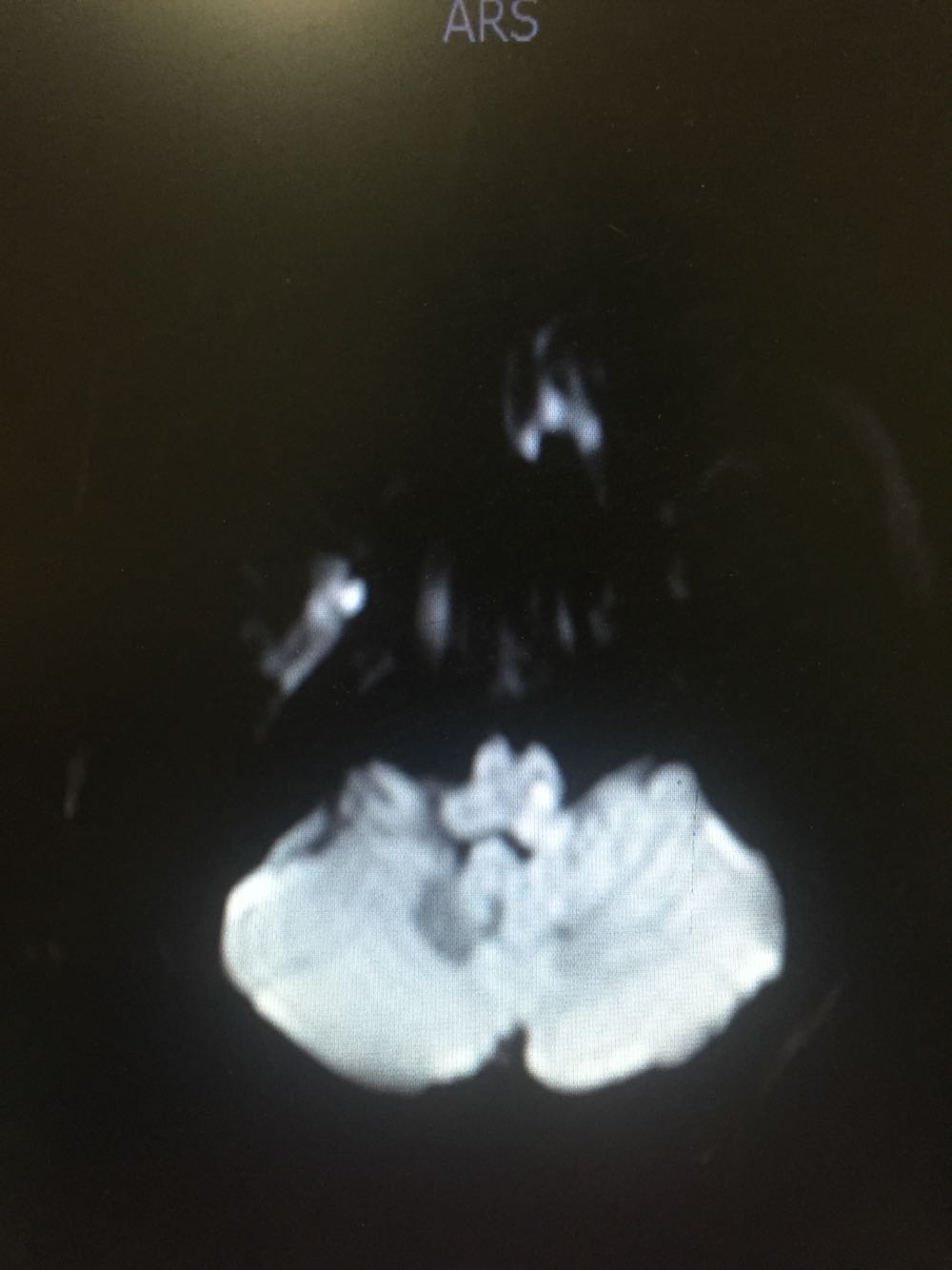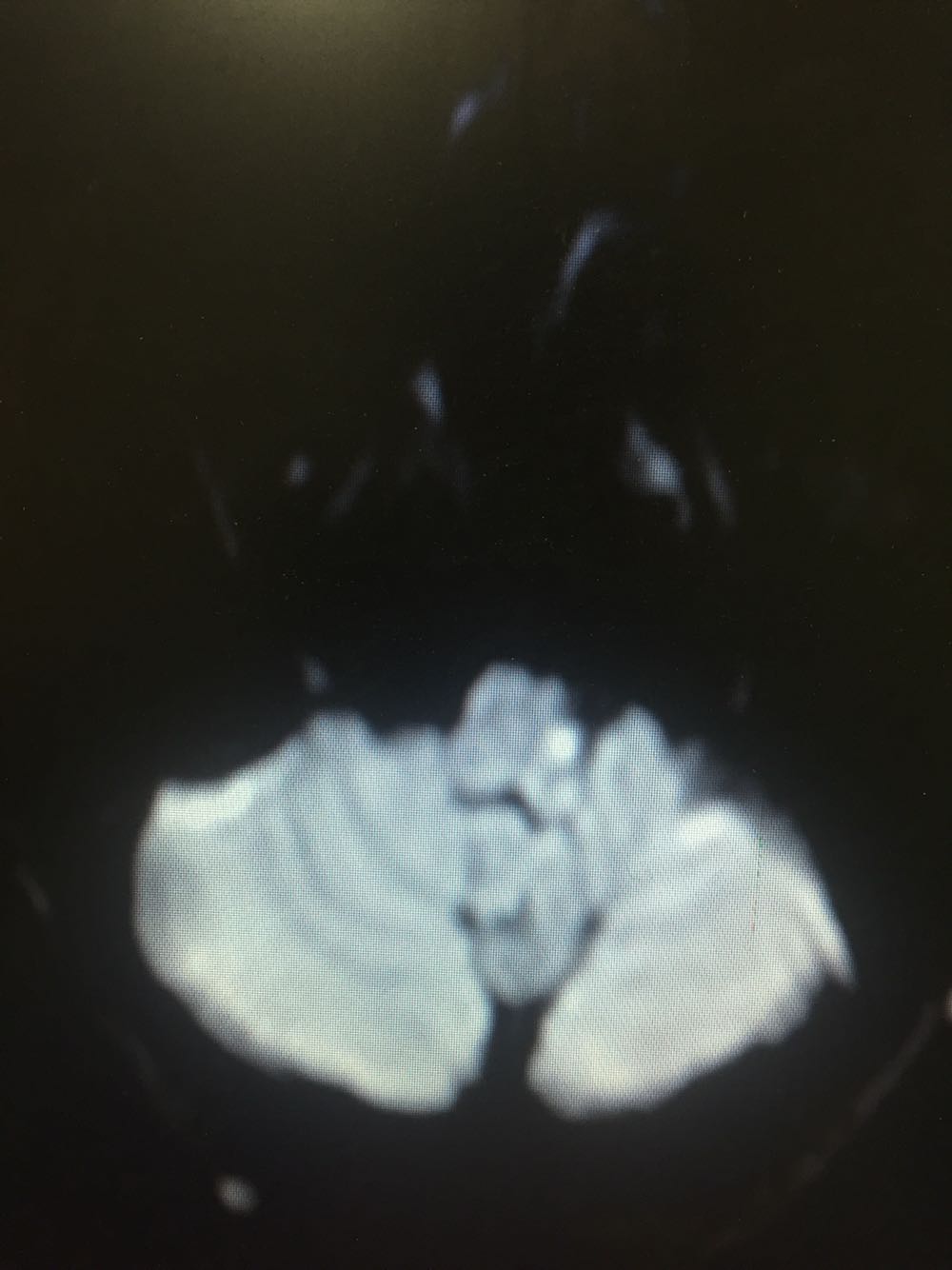 54岁男患,主因左侧肢体无力伴言语含糊1日入院,既往否认高血压、糖尿病、冠心病 该患者于入院前1日吴明显诱因出现左侧肢体无力,伴有言语不清,不伴有头晕,不伴有恶心、呕吐,吴头痛,无视物旋转及视物双影,病程中无意识障碍及尿便障碍,不伴有耳鸣及听力下降,于当地医院诊断为脑梗死,静点奥扎格雷、小牛血去蛋白、血塞通、降纤酶,为求进一步诊治而来我院。