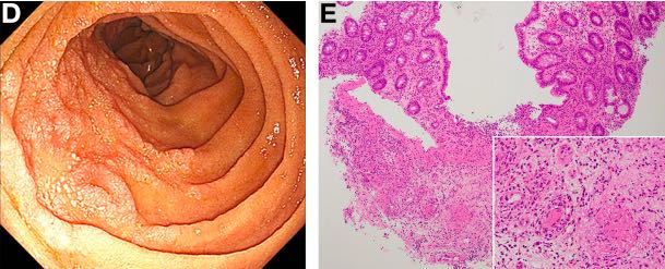 15年前患者使用干扰素α治疗丙型肝炎病毒(HCV)基因型1;后治疗失败。5年前患肾功能不全,由膜性增生性肾小球肾炎引起。后一直使用强的松和环孢素治疗。 入院前6个月,因腿部紫癜和腹痛在另一家医院治疗。此后,使用达卡他韦和阿那匹韦治疗HCV感染。但转入本院前出现腹部疼痛加重和便血。 体格检查,左上腹疼痛,压痛,下肢水肿,紫癜(图A),没有关节炎或周围神经病变的迹象。 胃镜检查显示不规则溃疡伴十二指肠的第二部分周围黏膜红斑(图B)。 结肠镜检查显示回肠末端散在糜烂在和结肠多个瘢痕性溃疡(图C)。 胶囊内镜和气囊辅助内镜检查显示十二指肠和小肠内的多个活跃性和瘢痕性溃疡。 该实验室的数据显示贫血(血红蛋白,9.1g/dL),轻度炎症反应(白细胞计数,10270/μL;C反应蛋白,0.55mg/dL)和肾功能不全(肌酐水平,1.75mg/dL)。免疫学试验显示低补体水平(C3,41mg/dL;C4,2mg/dL)和血清冷球蛋白阳性。患者抗核或抗中性粒细胞胞浆抗体阴性。 患者出现皮肤紫癜,从十二指肠到直结肠多处活跃和瘢痕溃疡,和冷球蛋白血症。我们使用冷却过滤法治疗患者,针对HCV感染使用直接抗病毒剂。治疗6个月后,补体水平仍然很低(C3,62mg/dL;C4,2 mg/dL),血清冷球蛋白呈弱阳性,胃镜证实十二指肠瘢痕溃疡(图D)。随后的检查还发现结肠直肠多个瘢痕溃疡,直肠活检检查发现血管炎与纤维素样坏死(图E)。