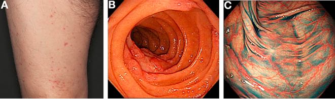 这些结果满足混合冷球蛋白血症血管炎的标准[1];因此,我们的诊断为患者的冷球蛋白血症性血管炎病变累及肠道。 血清冷球蛋白可发生在25%-30%的HCV感染患者中。据推测10%-15%的冷球蛋白血症患者发生血管炎。[2]冷球蛋白血症性血管炎主要累及小血管累及皮肤、关节、周围神经系统和肾脏。胃肠道受累是罕见的。