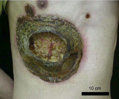 男,37岁,因右侧自发性气胸接受治疗。进行右侧胸腔置管后右肺完全复张。但置管部位周围组织开始出现坏死且极度疼痛,2周内发展为面积很大的深溃疡(图1)。