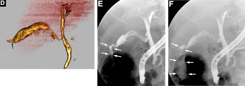 通过CT在胆道内没有观察到明确的穿孔部位。然而,伴随对胆道穿孔的怀疑、进行三维滴注CT胆道造影,显示泄漏的造影剂从胆囊底(图D,箭头)进入肝下间隙,引起自发性胆囊穿孔的诊断。内镜逆行胰胆管造影证实在同一部位有穿孔(图E、F,箭头)。放置内镜鼻胆管引流管,并持续引流胆汁。四周后,患者的一般情况稳定后进行胆囊切除术。组织学检查显示胆囊底有3mm穿孔,伴随与慢性胆囊炎引起的胆囊底部明显坏死。没有发现结石。患者顺利康复,最终病情好转出院。 胆囊穿孔是一种罕见但危及生命的胆囊炎并发症,伴或不伴结石,最近报道的死亡率为9.5%。[1]Niemeier[2]将该疾病分为3种类型:I型(急性),无穿孔和弥漫性腹膜炎;II型(亚急性)、局限性腹膜炎、胆囊周围脓肿;III型(慢性),胆囊肠瘘。这种分类仍在使用中。这名患者为I型穿孔。最常见的穿孔部位是胆囊底部,因为此处血液供应不畅。自发性胆囊穿孔的诱发因素包括感染、胆石症、糖尿病、动脉粥样硬化和类固醇激素治疗。超声,CT,磁共振成像,内镜逆行胰胆管造影术或胆道造影提示了该诊断。 如在本案例中观察到的,滴注CT胆道造影提供了胆道系统的高质量图像;然而,在一些国家静脉胆管造影介质的可用性是有限的。[3]诊断的困难造成治疗延误,导致高发病率和死亡率。胆囊穿孔应被视为不明原因腹膜炎患者的鉴别诊断。