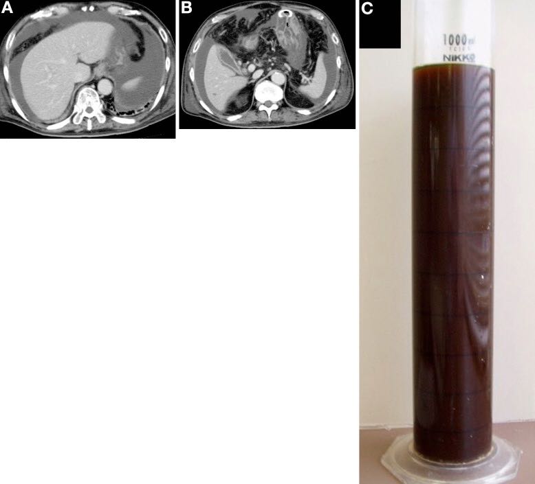 实验室检查结果显示:白细胞计数,44300/μL;血清白蛋白,2.6g;天冬氨酸转氨酶,1880U/L;丙氨酸转氨酶,1096U/L;胆红素,1.21mg/dL;C-反应蛋白,13.5mg/dL。 患者被诊断为感染性休克和急性肾功能衰竭并开始持续血液透析和机械通气。 腹部计算机断层扫描(CT)显示明显腹水(图A,B),诊断性穿刺显示为深棕绿色液体(图C),胆红素水平14.8mg/dL。